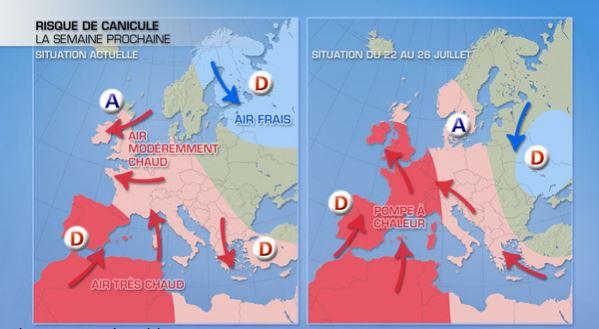 Juste au dessus, je disais qu'il y avait une possibilité de "pompe à chaleur" pour les semaines à venir. Bonne nouvelle : j'avais raison. Mauvaise nouvelle : j'avais raison. Avant tout, c'est quoi une pompe à chaleur ? Pour monsieur tout le monde, c'est un système qui pompe l'air extérieur (température froide), le compresse et le restitue en intérieur sous forme de chaleur. Pensez à la pompe à vélo : quand on l'actionne, ça chauffe. En météo, c'est un peu pareil, mais plus puissant. Prenez de l'air chaud (y'en a plein dans le Sahara), mettez en place un double système de pompe et larguer le chargement sur la France. Pour la pompe, on va prendre une dépression et un anticyclone. Une dépression, ça tourne dans le sens inverses des aiguilles d'une montre. Un anticyclone, dans le sens horaire. Placez les de manière à former un beau tapis roulant à air chaud et voilà, vous avez votre pompe à chaleur. (bon en fait c'est beaucoup plus complexe que ça mais c'est globalement le principe) Résultat : depuis plus d'une semaine, il fait plus de 30 dans le sud ouest et 30 sur une grande façade ouest. La semaine prochaine, ça va être la fête pour tous, avec des pointes à 40 dans le sud ouest et 30-35 pour le reste de la France (à part en manche).