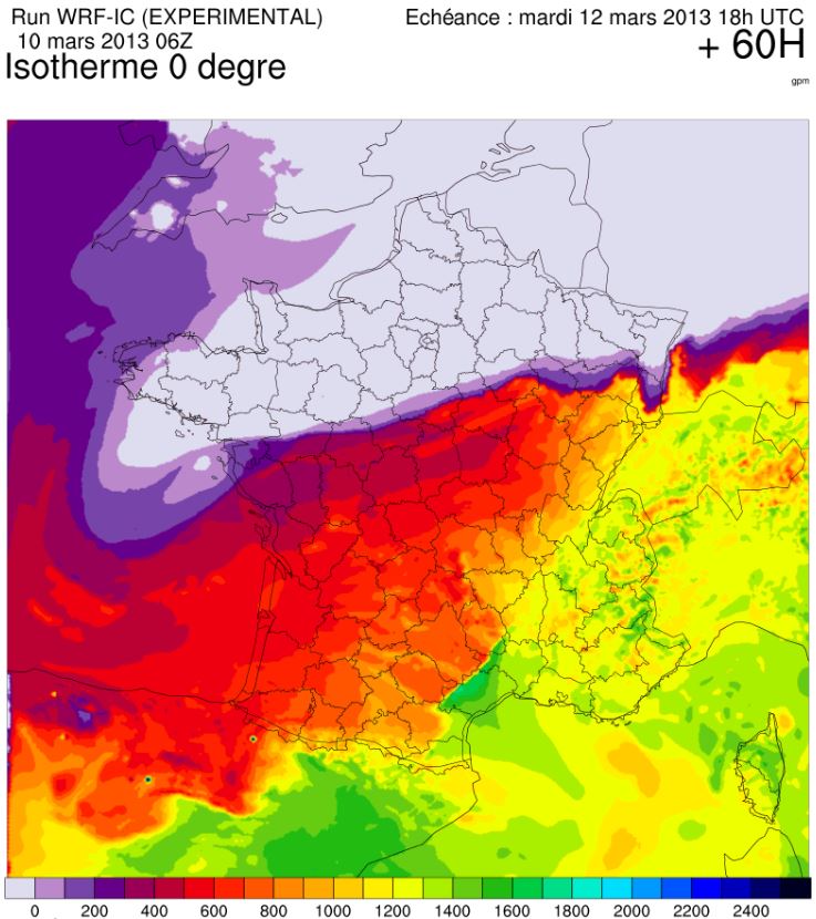 C'est peu dire que dans les heures à venir, le conflit des masses d'air va être particuièrement violent. En quelques dizaines de kilomètres, vous pourrez perdre ou gagner 10 ou 15°C. Le fameux Iso 0 mardi soir. L'échelle des altitudes est bas du graph.- Les Mésaventures professionnelles de Patache22