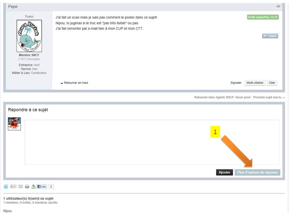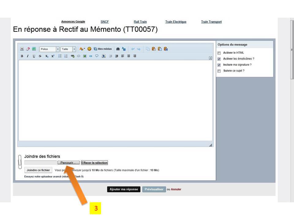 2. C'est noël aussi voilà ton cadeau Pepe : un tuto d'insertion d'image ! A noter qu'il existe une autre méthode à partir d'images qui proviennent d'hebergeurs ou de sites mais on va se limiter ton problème : insérer une image de ton pc dans un message. 1) Sélectionner "plus d'options de réponses" afin d'avoir ce qu'il nous faut juste après. 2) Clapoter ton message comme d'habitude. 3) Sélectionner "Parcourir" pour aller farfouiller dans ton PC. 4) Trouver ton image dans tes dossiers, sur ton bureau ... enfin là où tu l'as mise. 5) Faire "Joindre fichier" pour télécharger l'image sélectionnée dans le message. 6) Un geste un contrôle : l'image est bien là, y'a plus qu'a faire "Ajouter ma réponse" pour valider. Ho ho ho ... et joyeux noël ! Edit : Sujet dissocié de celui-ci : Roukmoute