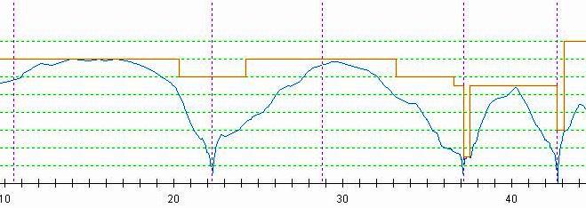 Le trait bleu foncé c'est la vitesse mesurée, donc celle des roues qui est celle du train normalement, sauf en cas de patinage ou d'enrayage.