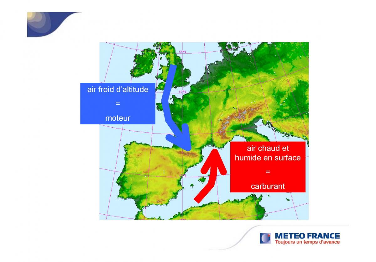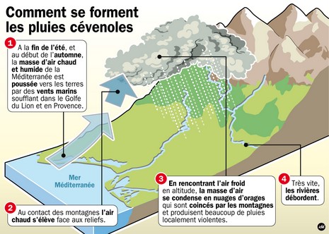 Pluies violentes sur le sud-est, crues, victimes, dégâts ... Tout ça porte un nom : un épisode cévenol. Pourquoi épisode ? Car ça n'a rien d'isolé ou d'exceptionnel, chaque année en cette période ils ont lieu, à plus ou moins forte intensité. Pourquoi cévenol ? Car le massif des Cévennes est le lieu où se forment ces phénomènes. La chaleur estivale chauffe la méditerranée, faisant le plaisir des touristes. Mais quand l'automne approche, les dépressions se font plus fréquentes. De plus la masse d'air devient moins chaude sur l'Europe. Nous avons donc une grande bassine d'eau chaude qui s'évapore, de l'air plus frais qui gagne peu à peu en altitude et des dépressions pour faire se rencontrer tout ça. Les forces en présence sont considérables, les conséquences en sont tout autant catastrophiques. Encore une fois, rien d'exceptionnel, un peu comme la mousson qui chaque année vient inonder le sud est asiatique. Pas exceptionnel mais amplifié par la présence humaine qui bétonne, et goudronne toujours plus de surfaces, faisant de tous ces terrains des lieux d'écoulement là où ils devraient absorber une partie des précipitations. Car il faut bien comprendre que les quantités d'eau qui tombent alors en quelques heures sont énormes : il arrive souvent qu'on mesure plus de 300 l litres par mètre carré en 4 ou 5 heures (soit 4 à 6 mois des pluies à Paris) De telles quantités d'eau emportent tout, et puisqu'on est sur une forum ferroviaire, supports caténaires, voies, ponts ... rien ne peut résister. les gares sont noyées, les alimentations électriques hors service ...