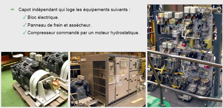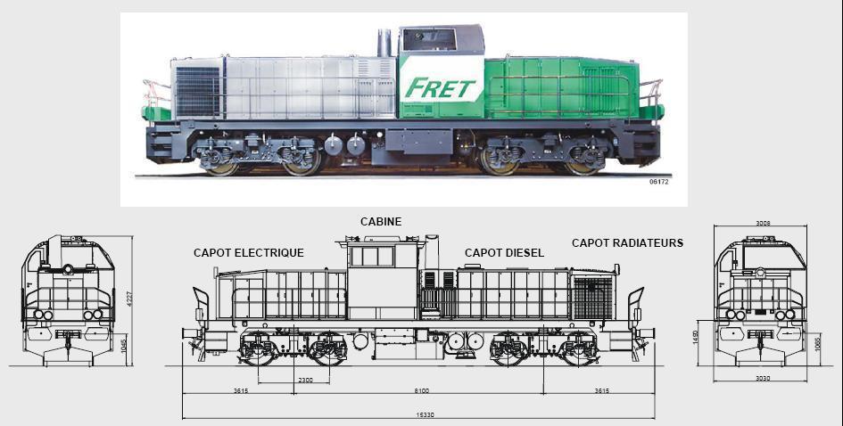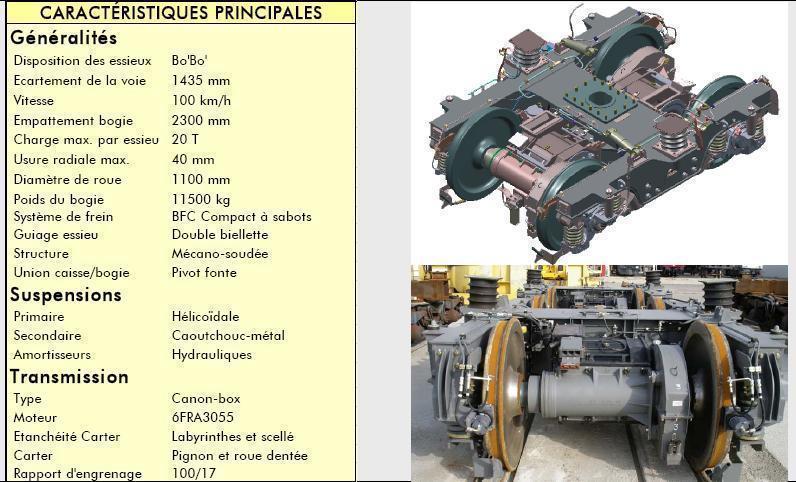 Concernant le moteur diesel : Il existe un ECM (Module de Contrôle Electronique) qui reçoit en permanence un ensemble de paramètres moteur provenant de différents capteurs. Ces paramètres sont traités pour le contrôle moteur. L'ECM envoi des signaux électriques afin de piloter les sytèmes assurant le fonctionnement du moteur. Il dispose d'une mémoire flash. La mémoire flash contient les différents codes (diagnostic et incident) qui permettent de savoir si un problème est apparu. Un code diagnostic indique un pb électrique alors qu'un code incident indique un pb du moteur diesel (par exemple, un code incident est généré si la pression d'huile est insuffisante). Le moteur est équipé d'un démarreur pneumatique, mais je n'en connais pas son fonctionnement exact. Je rajoute aussi une petite image présentant les caractéristiques principales des bogies de la BB 460000 :