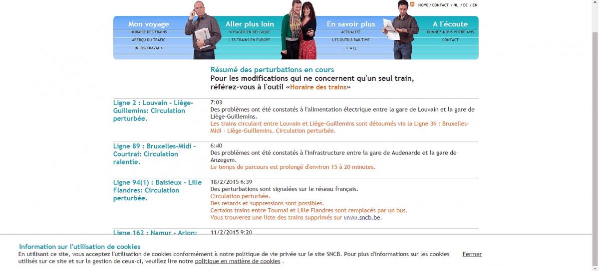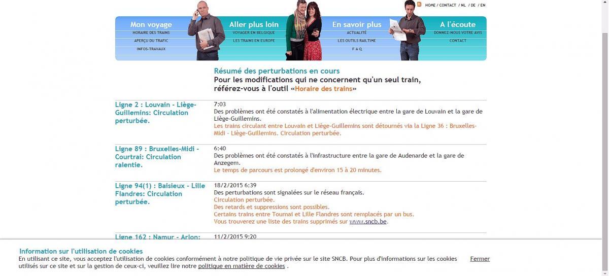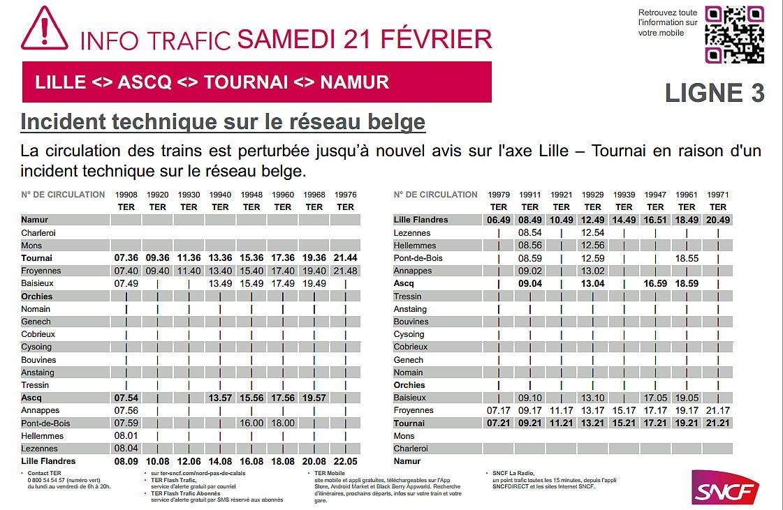 Depuis le début de la semaine suite a 4 DDS la semaine dernière et 1 lundi les AM96 SNCB sont interdites de circulation entre Lille et Tournai Apparemment suite a des problèmes sur les transfo Seuls circulent les BIBI en mode Diesel et les frets les autres trains sont supprimés certains remplacés par des cars ....... La version SNCF (incident technique sur le réseau Belge) La version SNCB (perturbations sur le réseau français)