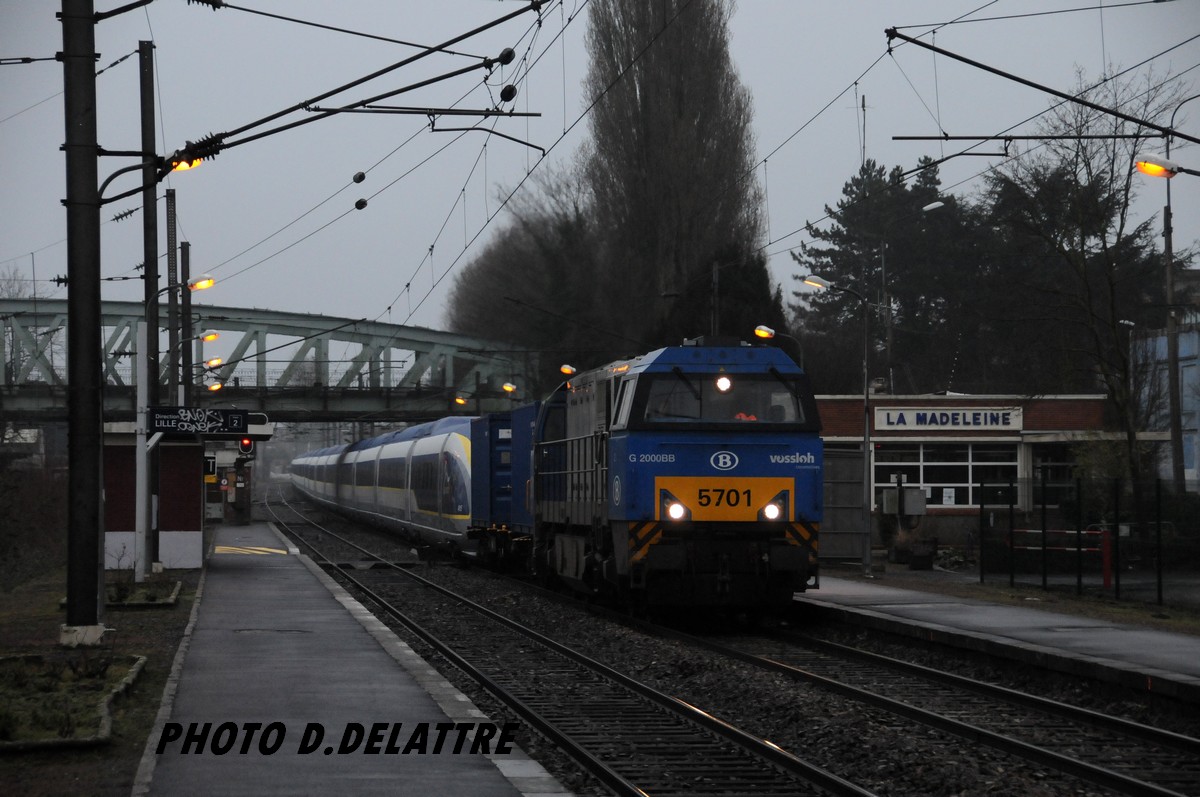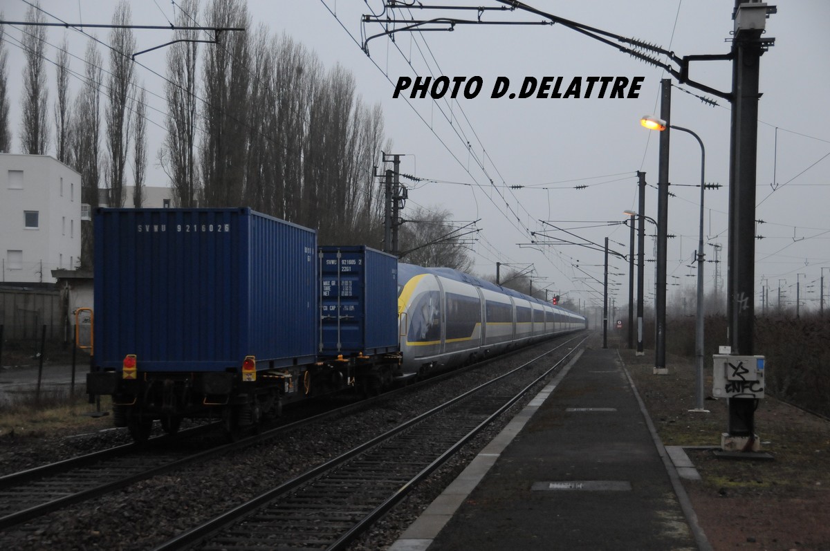 Bien vu !! En effet il s'agissait d'un acheminement pour livraison a Eurostar de la rame 4015/16 en provenance d'Allemagne et a destination de Londres CV le wagon est utilisé comme wagon raccord Le convoi vu de tete avec l'HLD 5701 SNCB qui a remorqué la rame de Gand a Calais lors de son passage en gare de La Madeleine
