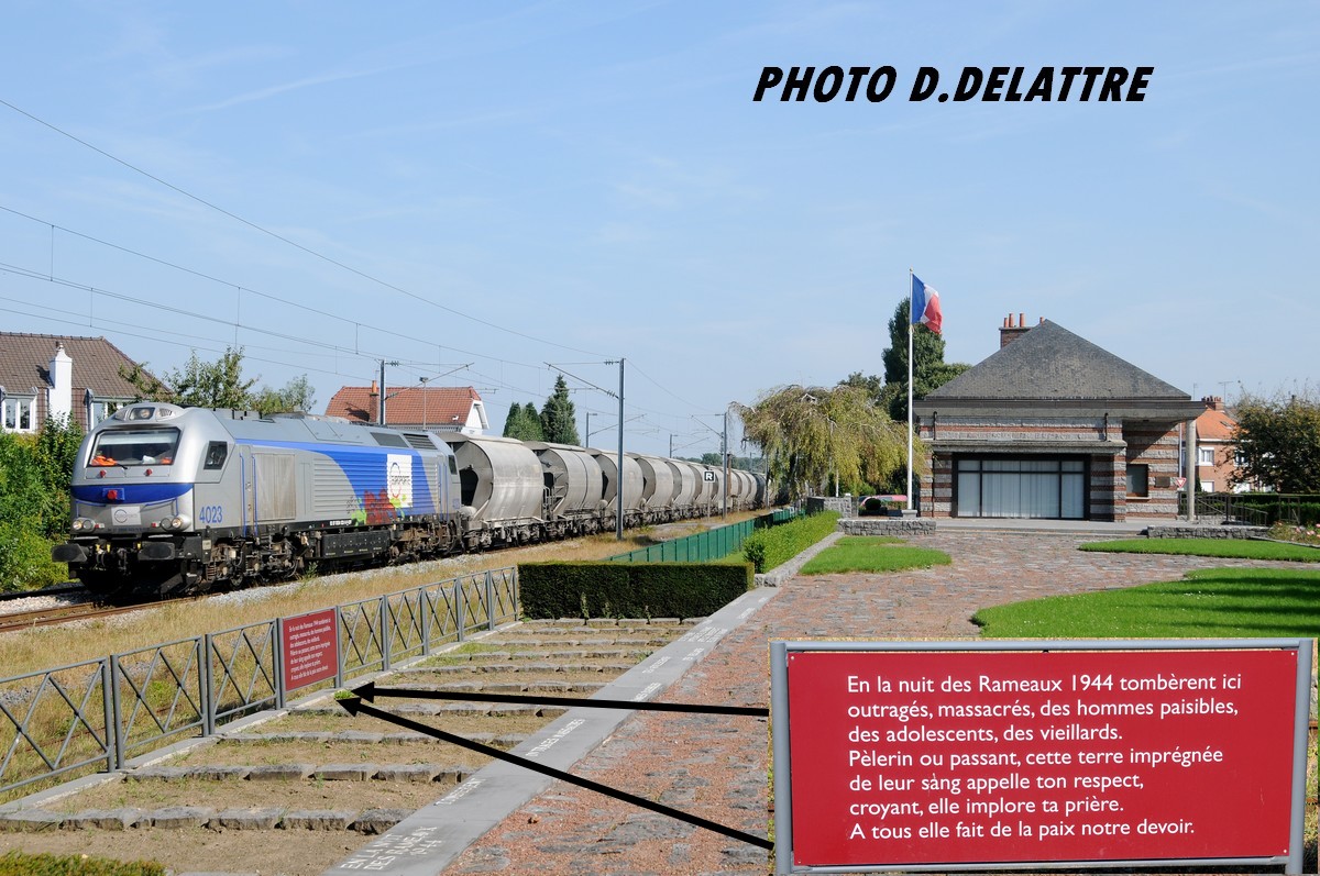 C'était au siécle dernier !! Une photo des €4000 qui fréquentent la ligne €4023 avec un train de ciment pour Rouen Passage aux pieds du mémorial du massacre d'Ascq de la nuit des rameaux 1944 Et une AM96 dont il est question dans ce sujet Rame 464 décorée d'un diable rouge a Ascq avec un Lille - Liège