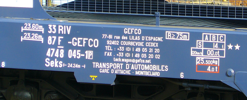 Au contraire, le nouveau marquage permet de connaitre le responsable du wagon plus simplement. Avant , il y avait le reseau d'immatriculation, puis le gerant du wagon et / ou le proprietaire ( voir photo ci dessous ) Dans ce cas on avait 87 en reseau immatriculant et VTG a contacter en cas d'incident, mais sans etre sur que VTG soit le proprietaire du wagon. Desormais, le seul responsable est celui qui immatricule, et il est repris dans l'immatriculation, en son nom propre, meme si il passe par une gerance : Les adherents à la CUU vont d'ailleurs d'ici quelques mois acceder à la base de donnée wagon, qui permettra en cas de besoin d'identifier et obtenir les coordonées du proprietaire du wagon, seul responsable de celui ci en saisissant le numero de wagon les coordonnées apparaitront. Ce nouveau marquage est appliqué au fur et a mesure des revisions de wagons, cela signifie que pendant plus de 6 années les deux marquages vont encore cohabiter. L'interet c'est de permettre une reactivité plus forte pour les demandes de reparations en supprimant des intermediaires non decisionnaires de l'action a faire sur le wagon. Ce qui donne, pour l'ancien marquage des semaines entre la reforme et le retour en atelier ou la reparation sur place si elle est possible. La CUU constitue actuellement la base des vehicules, et vise la disponibilté de l'outil d'ici fin 2010 ( cible ) Le parc de wagon etranger est aussi souvent maintenu par des entreprises francaises On a pu le constater lors de notre formation visiteur chez Lormafer, que de nombreux wagons Allemands, des pays de l'Est ou Suisse ou Francais y sont réparés