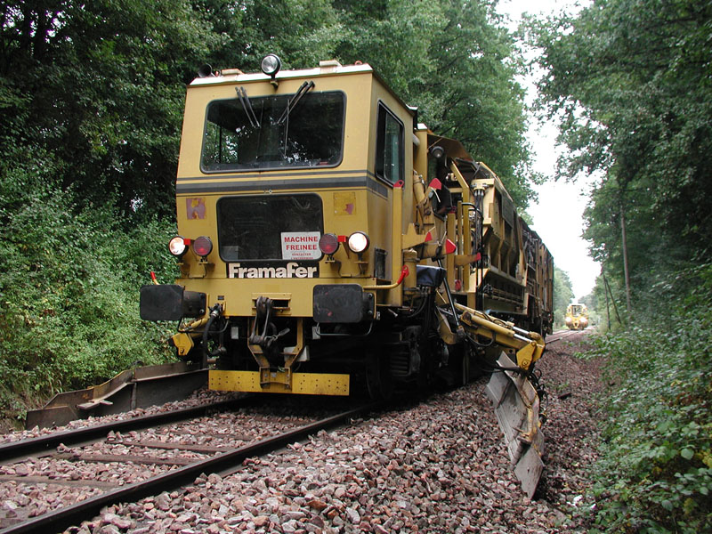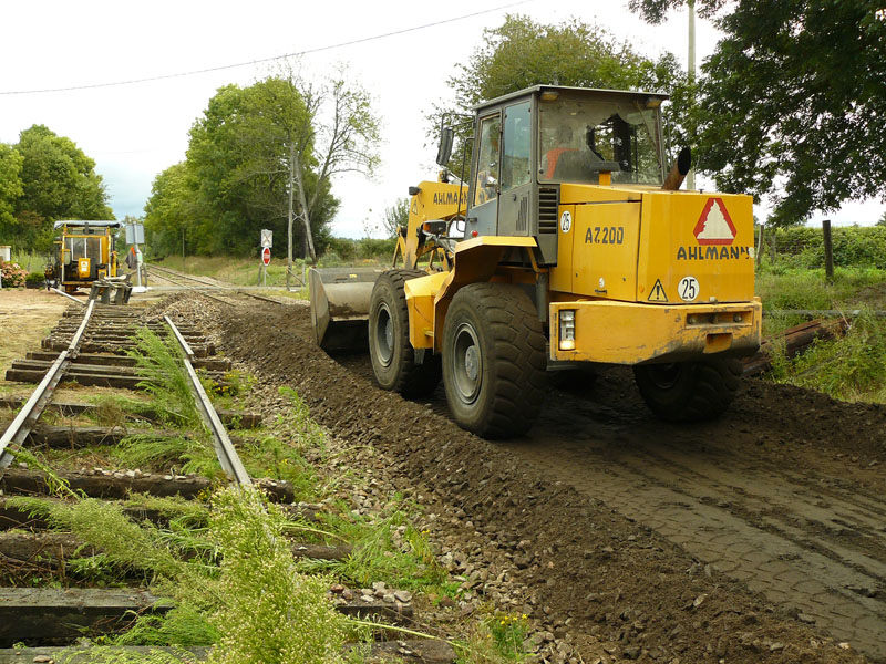 "Si vous avez des idées pour compléter cette méthodologie, je suis à l'écoute. A noter que j'ai limiter au maximum le dégarnissage du ballast existant et j'ai pris comme base de relever la voie afin d'avoir une épaisseur de 15 cm de ballast sous traverse. Le principe de base est de déposer la voie actuelle (complétement) et d'effectuer un régalage du ballast existant et de faire un relevage simple par ajout de ballast. Quand cela n'est pas possible (j'ai quelques ponts métalliques que je ne peux pas relever ou encore des pentes maximales à respecter), un dégarnissage est nécessaire (voire même un décaissement de la plateforme = à déconseiller). Dans ce cas, je réutilise une partie du ballast par criblage et réinjection. " ==> pour moi cette opération s'appelle une épuration plutot qu'un régalage non ? Comme par exemple ici pour se raccorder sur le niveau de la route de ce PN sur le chantier du Morvan cet été . Le régalage c'est la constituton de la banquette ou de la banquette renforcée selon la typologie de la voie et la repartition du caillou sur l'ensemble de la voie avec balayage des traverses . La aussi cet été sur le chantier du Morvan , la regaleuse repartissait le ballast deposé par les tremies dans les cases et sur les banquettes .La c'etait le dernier passage de finition et de nettoyage avant la fin du chantier