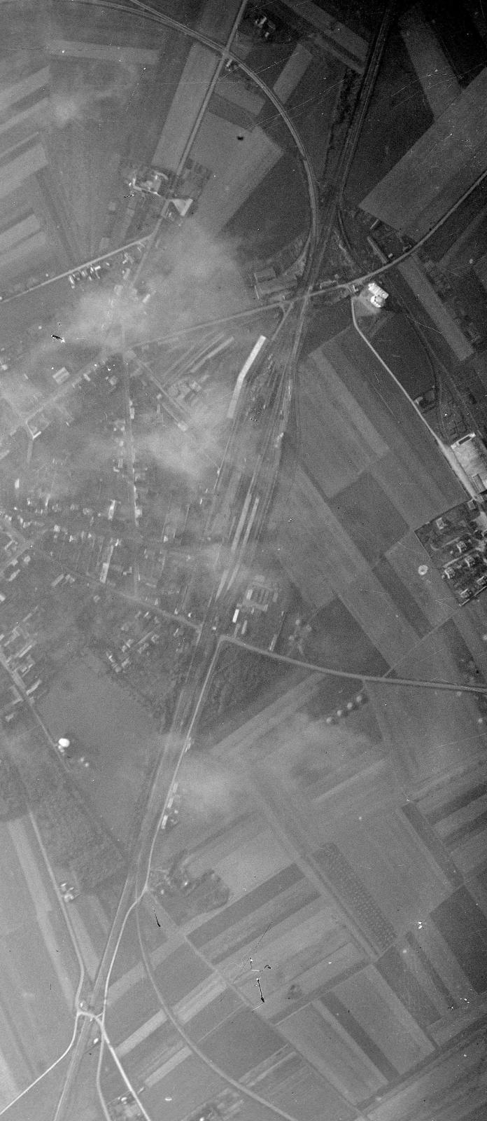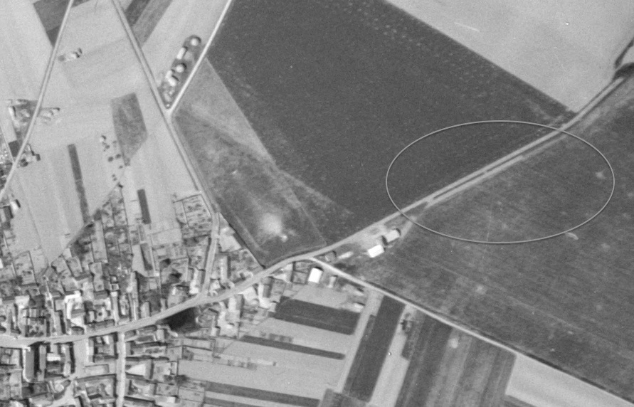 Merci de toutes ces précisions : c’est donc bien le tracé grisâtre que l’on voit sur la photo aérienne de 1949 (dans l'ellipse). J’ai aussi envoyé ma chère maman en service spécial à la mairie pour voir si elle peut collecter des images d’archives à la mairie. On a l'impression sur cette photo aérienne d'une trace de ruine dans un champ (immédiatement à gauche de l’ellipse), comme un champ de course. Bref.