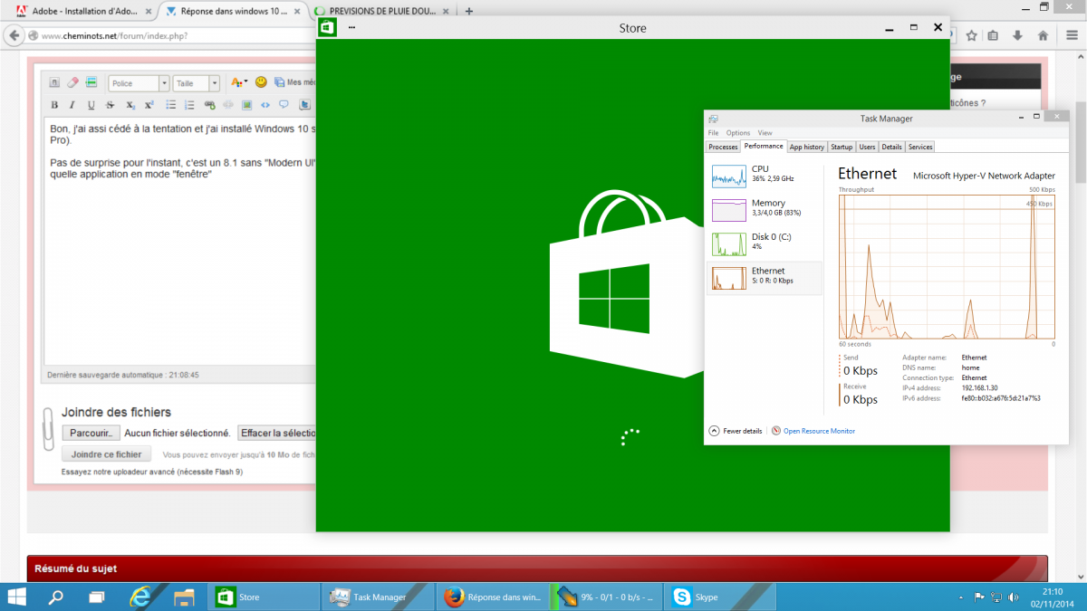 Bon, j'ai assi cédé à la tentation et j'ai installé Windows 10 sur une machine virtuelle (je teste en même temps hyper-v, l'outil de virtualisation de Microsoft, inclus dans Windows 8 Pro). Pas de surprise pour l'instant, c'est un 8.1 sans "Modern UI" et avec un menu "démarrer" qui m'a l'air assez bien foutu. J'apprécie particulièrement la possibilité d'afficher n'importe quelle application en mode "fenêtre" redimensionnable :