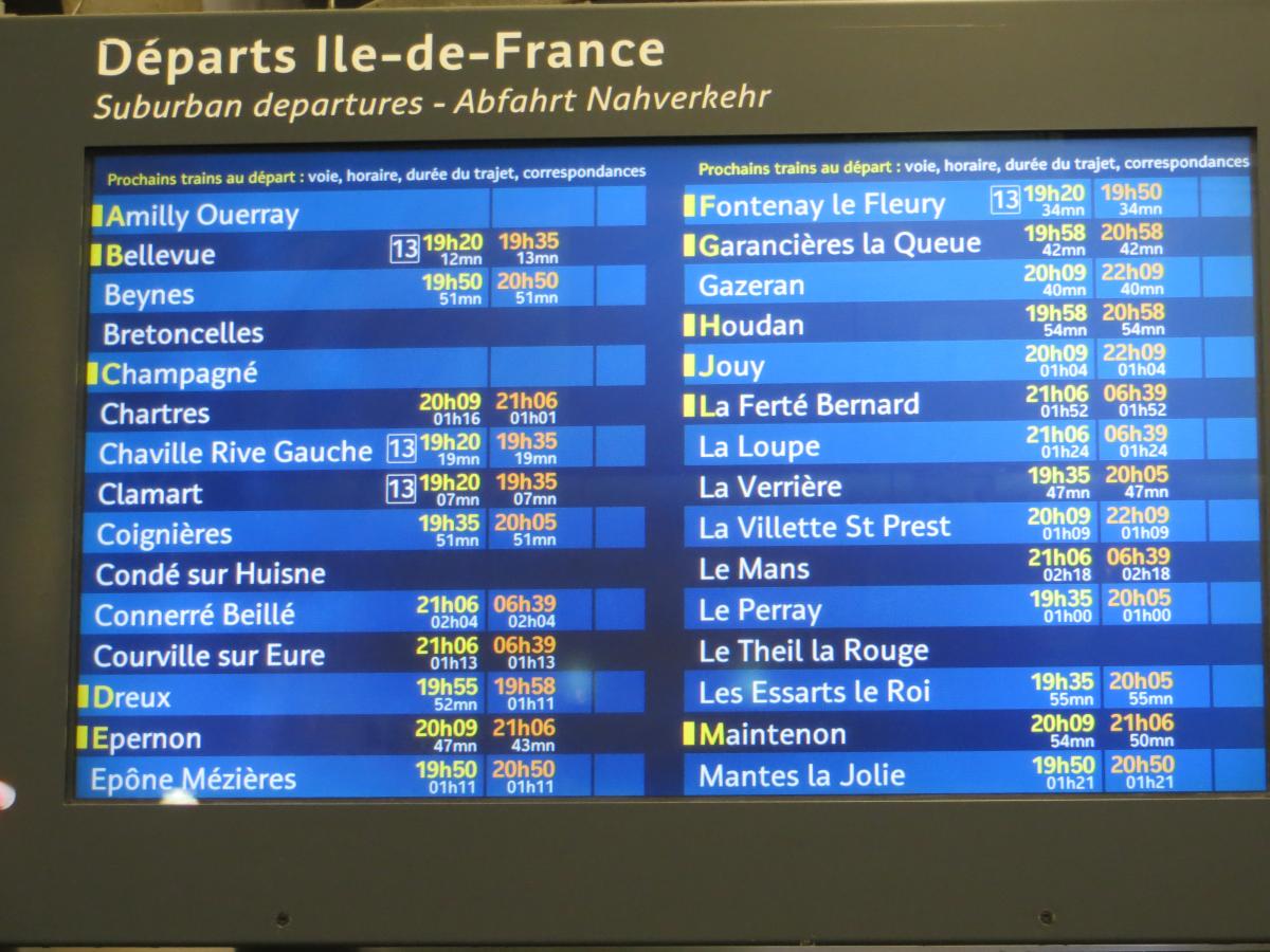 23. RER C en mode Castor : Ecran d'affichage Transilien : Très pratique quand on ne connaît pas bien le réseau et les dessertes ! Parce que la desserte qui n'est affichée que pour les deux prochains trains, et dans l'ordre... pas facile de trouver sa gare ! Par contre je ne savais pas que Le Mans faisait partie de la desserte Île-de-France ! nonmais Zut, pas de photos de trains sous la main