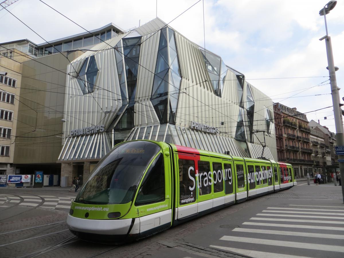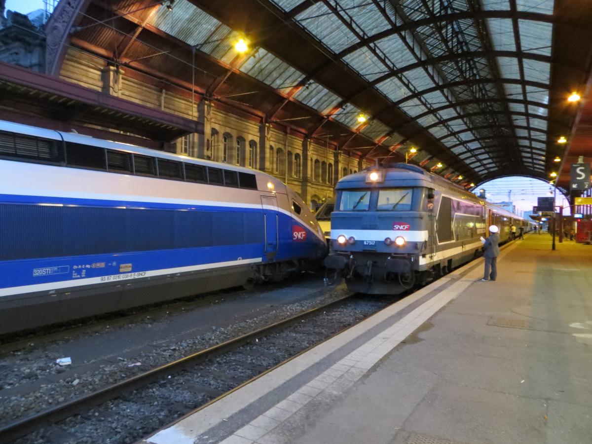 Allez, puisqu'on en est au tram : un Eurotram "Strasbourg, the Europtimist" devant... euh... Une 67400 en tête d'un Corail TER Strasbourg-Sarreguemines ("à l'heure", seulement 12 minutes de retard) devant un TGV spécial "ESCA Europe" (UM Euroduplex, rien que ça !) :