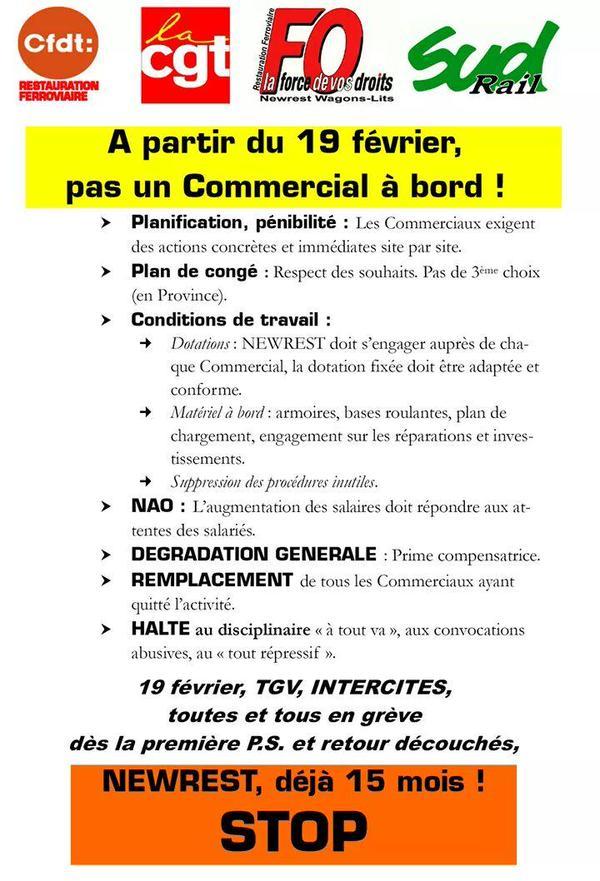 5. Extraits : Ce préavis est motivé par les sujets suivants :  L’évolution des salaires et pensions de retraites par l’ouverture de négociations dans les plus brefs délais ;  La politique de l’emploi et la programmation des recrutements à statut pour l’année 2017, afin de garantir une production de qualité et sûre ;  La sécurité des personnes et des circulations ferroviaires en lien avec la sous-traitance, l’externalisation des missions de cheminots, la formation et le respect de la réglementation dans les différents domaines RH et professionnels.  L’ouverture de négociations sur les 3 textes : RH0677 (Titre I, Titre II et Titre III), 0657, 0073 et l’arrêt d’un éventuel processus dérogatoire quant au régime de travail général considéré pour l’ensemble des agents d’une filière, d’une activité voire d’un EPIC. Et :  La mise en place de mesures conservatoires consécutives aux conclusions des expertises réalisées par l’entreprise et sous la responsabilité du CCGPF ;  La mise en place de limites de temps de travail effectif (amplitude, grande période de travail…) similaires à celles d’aujourd’hui et d’un dispositif garantissant le respect des temps de repos ;  La mise en place d'un système auto-déclaratif d’enregistrement des heures de travail effectuées garantissant le respect des 35 heures et permettant de comptabiliser les heures supplémentaires ;  L’identification des postes relevant d’une réelle autonomie par une consultation des IRP ;  La mise en place d’un système d’alerte et de prévention des risques spécifiques ;  L’ouverture de négociations en établissements en vue d’adapter les Cadres d’Organisation aux charges de travail de l’encadrement, y compris par les services d’appui ou les assistances nécessaires et l’ouverture d’une négociation sur l’emploi. 20170120_preavis_greve_tous_services_CGT_02022017.pdf 20170120_preavis_greve_FJ_CGT_02022017.pdf