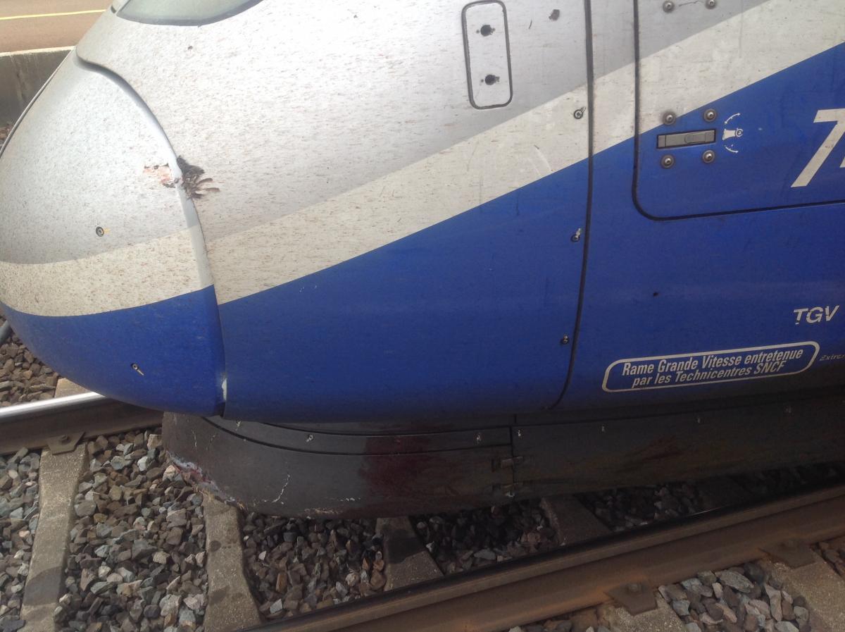Relève ce matin du TGV balai de la LGV Rhin Rhône,qui à fait PAF la biche à Altkirch (140km/h) et PIF l'oiseau sur la LGV (220km/h).