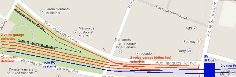 J'ai reconstitué le schéma des voies sous la galerie de St Ouen. On peut situer à peu près où a été prise la photo : sur l'ancienne plateforme de la voie qui partait vers les docks, à l'endroit où la galerie est la plus large et où il ne subsiste qu'une seule voie PC difficile à apercevoir à l'extrême gauche.