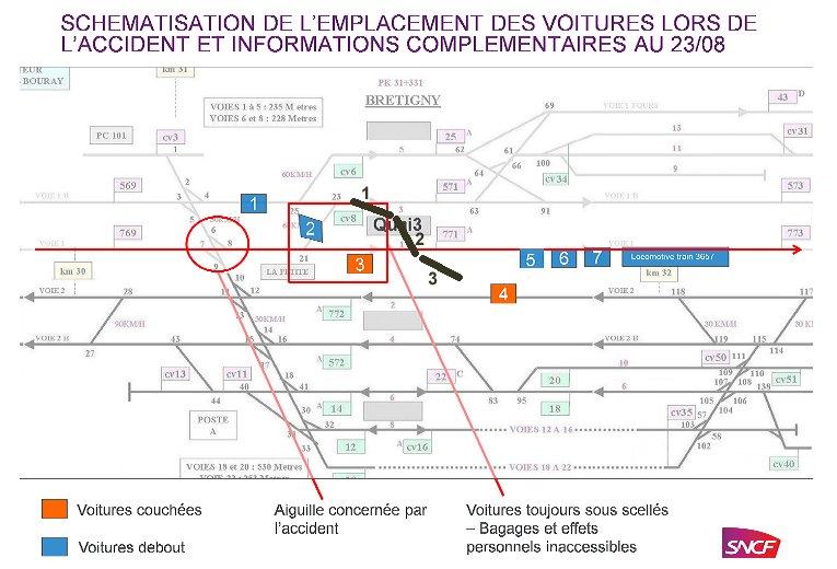 Désolé de vous contredire monsieur le "vieux con de CRLP à PMP" , mais c'est vous qui n'avez rien compris. Sur le schéma inclus par la sncf, les 3 dernières voitures du train sont mal positionnées par rapport aux aiguilles, et en l'occurrence la toute dernière voiture se situe après l'aiguille repérée 23, pas avant. Peu importe l'ordre de numérotation utilisé. J'ai replacé sur le schéma l'endroit approximatif où devraient se trouver ces voitures.