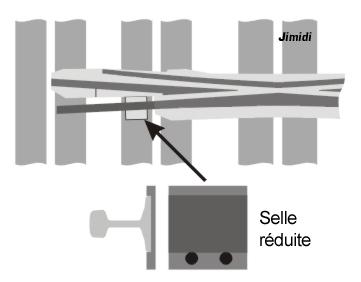Allez, comme disait un autre Lillois de naissance comme moi, grand de taille et à grand nez aussi : - "Je vous ai compris!" Alors en fouillant dans mes moults docs, j'ai pris soin de faire un petit schéma vectoriel (comme ça, pas de soucis de droit d'image et autres) qui permet de comprendre la disposition de cette pièce particulière que l'on nomme : selle réduite et qui sert au calage et maintien du rail en cet endroit précis d'un coeur de traversée : Et puis j'en ai profité pour modifié mon précédent message en corrigeant une grosse bétise, une vilaine confusion de terminologie où j'avais écrit "semelle" en lieu et place de "Selle réduite"... Pour le coup, la semelle était juste bonne à me la recevoir quelque part! Ami calmant, Jean-Michel