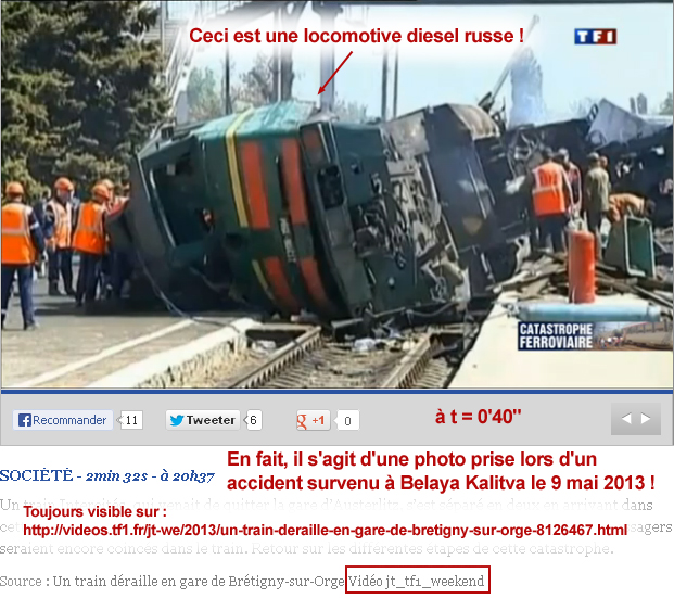 Je suis malheureusement obligé de corriger quelque peu mes propos et même si ça reste approximatif et non précis:La pendule incluse dans la vidéo, à considérer la distance entre les deux ponts et relevé sur image satellite (250m à peu près), donne un delta t d'environ 5s. Or 250 / 5 = 50m/s et 50 x 3600 = 180 000m/h = 180 km/h Même à considérer une marge d'erreur large de 10 pour cent pour les approximations de "mesures", ça me laisse sans voix... Sinon, l'absence criante d'explosion en tout début de déraillement dans cette vidéo (de diffusion controversée à juste titre, je l'admet!) aura au moins la vertu de taire les tenants de la "théorie du complot" qui voient désormais systématiquement dans tout accident dramatique l'oeuvre de terroristes! Jean-Michel