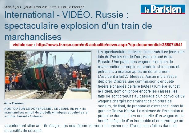 Bonsoir, Quand la précipitation et la fièvre du scoop occulte la nécessité de vérifier ses sources. J'ai attendu dimanche dernier à midi, mais Claire Chazal n'a pas daigné présenter la moindre excuse. C'était au JT de 20h la veille... et ça fait désordre : La seconde photo présente l'article des faits originaux à l'époque (Belaya Kalitva le 9 mai 2013) : Je n'ai pas trouvé d'info au sujet de cette monumentale bourde de TF1 sur le forum, si d'aventure le fait fut quand même signalé, j'en suis désolé. Cordialement, Jean-Michel
