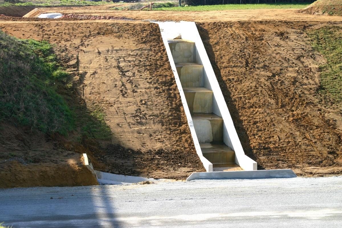 Autre manière de construire des caniveaux. Enrobé au niveau de Sainte Corneille avant la mise en place du ballast. Cascade récupération des eaux de pluies amont. Infrastructure des ponts vu de la voie.