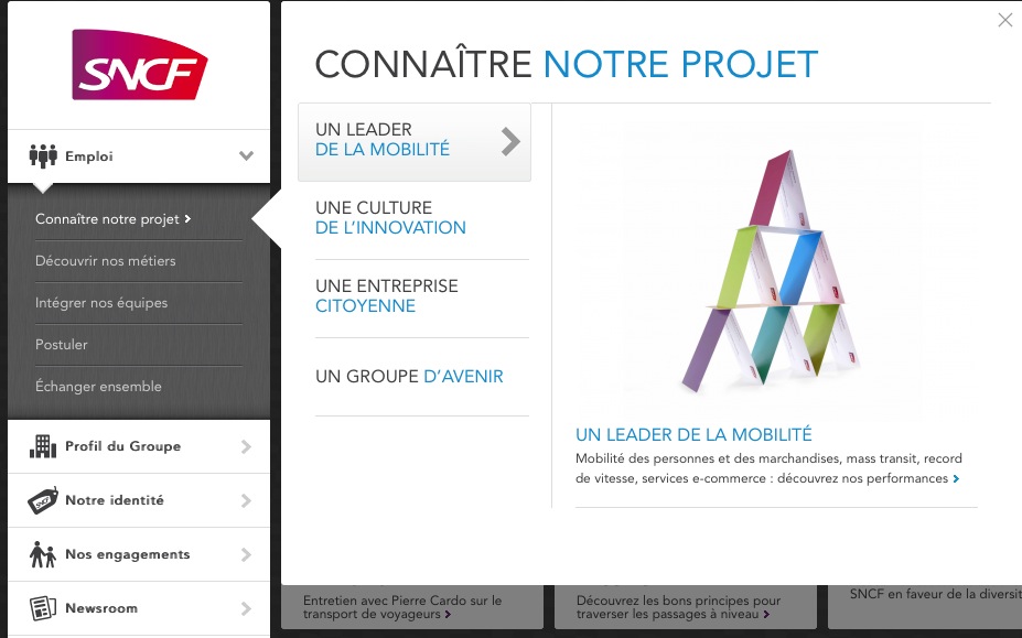 Tu as raison, j'essaye donc de ne pas m'arrêter au site SNCF où le C veut dit chemin de fer. Donc, je vais voir sur le site de SNCF (je n'ai pas mis "la", je progresse) pour essayer de voir la raison sociale de cette entreprise. Ce n'est pas le transport mais la mobilité donc les déambulateurs, peut être aussi, on rejoint donc les soins palliatifs. Par contre, j'ai failli m'étouffer en voyant une image symbolique qui laisse clairement voir une politique type "château de cartes" Donc, un simple petit coup de vent et hop! Ils sont formidables, les communicants de SNCF. Sérieusement, on est dans le flou le plus total et les conséquences sont donc faciles à observer et la suite à imaginer. En gros, la politique actuelle, c'est faire faire à des entreprises qui ne savent pas faire ce que la SNCF sait faire et faire faire à la SNCF ce que d'autres font bien et que la SNCF ne sait pas faire. On s'étonne que la France ne marche pas très bien.- La SNCF investit dans la voiture (covoiturage, location entre particuliers, ...)