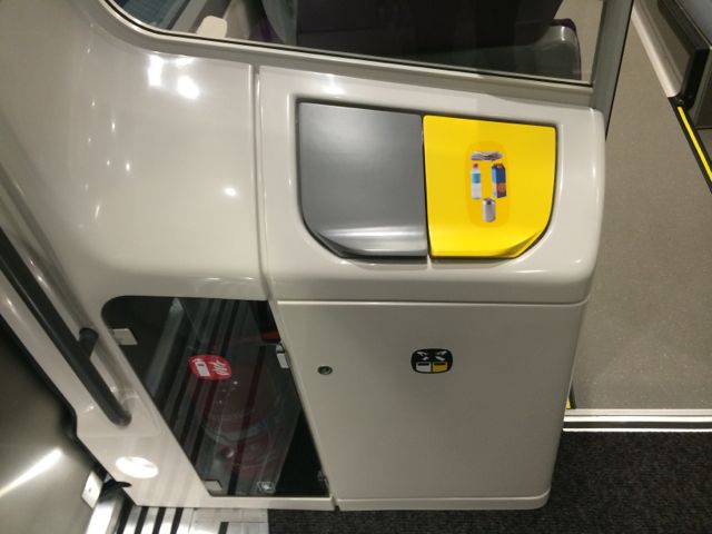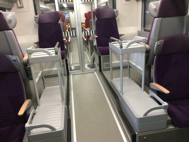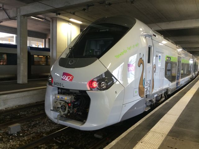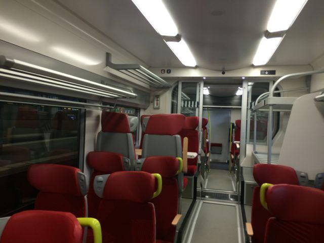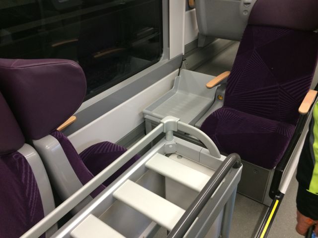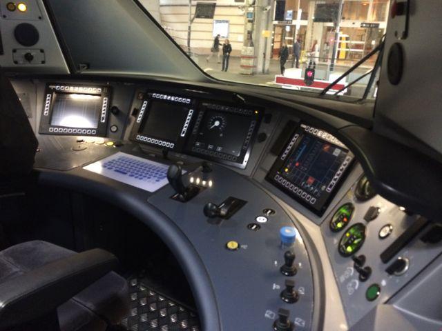 12. C'est du bi-mode, tu sais. Sinon, à droite du pupitre, on ne voit pas sur la photo, un lecteur de carte qui permet l'identification automatique du conducteur. Pas besoin de pianoter pour ça. L'éclairage des voitures me fait penser à un métro des années 60. Les sièges sont "en bois". J'essaierai quand ça roulera pour voir si le confort est aussi bas de gamme que mon ressenti d'hier. J'ai demandé au chef de ligne pourquoi un matériel en version TER pour de l'intercité. Je n'ai pas bien compris sa réponse évasive. Pour les toilettes, elles sont spacieuses, on tient facilement à 4 ou 5 avec fauteuils roulants. Le scharf sans trappe, ça fait un peu "braguette ouvert", je trouve. Bon, affaire à suivre dans la vraie vie et surtout, j'attends la version intercité pour voir les différences.