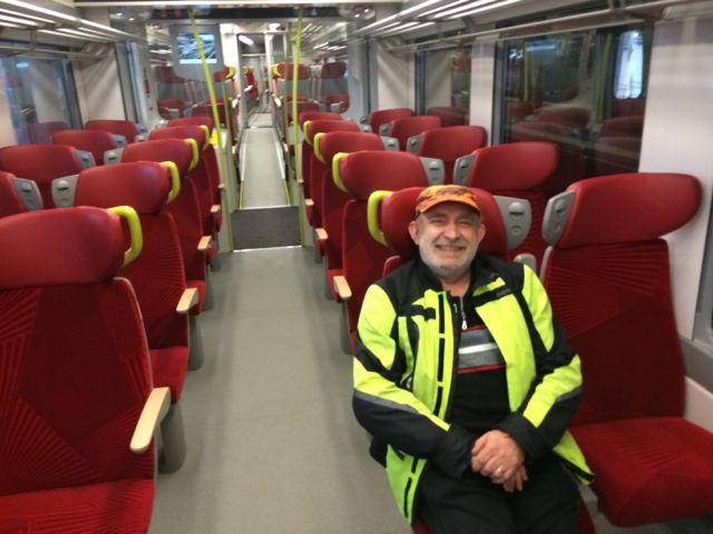 14. Le Regiolis en bas de chez moi Un célèbre forumeur teste le confort Il a l'air heureux comme ça mais il avait mal au dos au bout de 10 minutes Non, non, il n'est pas gros, ce sont les sièges qui sont étroits. C'est franchement en dessous des 72500 qu'ils vont remplacer Bref, impression très mitigée, service minimal Par contre grande nouvelle, le tapis roulant dans le sens pair à PMP va être réparé d'ici deux ans.On rêve. J'ai des chances de le voir de mon vivant. Disposition curieuse des emplacements à bagage en première (si, si, ce sont des premières, c'est écrit) Moi je croyais que le petit bac, c'était une place clébard ou nourrisson, le chef de ligne n'a pas compris mon humour.