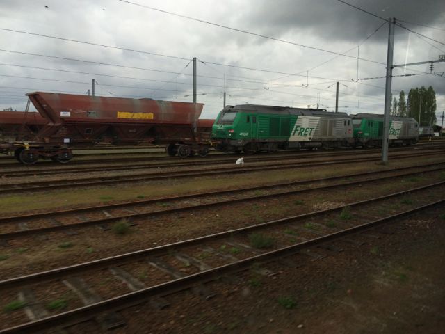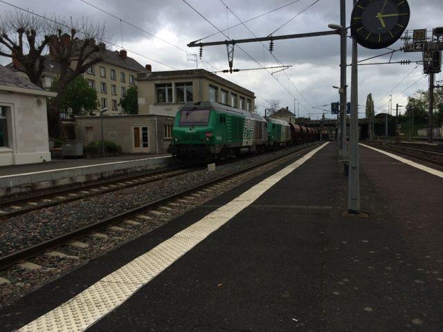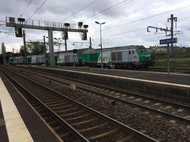 Thouars, un fret sur le faisceau, prêt au départ Le voilà qui me rejoint à Saumur Et un petit train de machines en prime. Qui a dit que le diesel sous caténaire; c'était le mal?