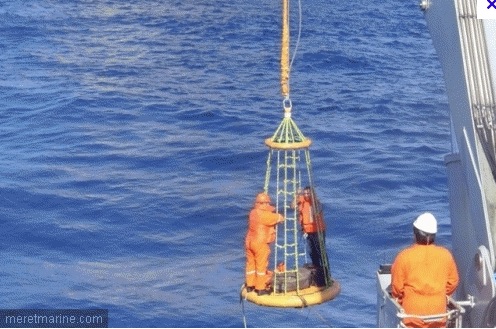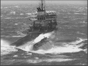 Et un fisherman's blues en entier! C'est bien, hein? Ce soir là, on a tété interrompu par l'officier de quart qui est arrivé en trombe avec la VHF portable. Vu sa tête, je me suis dit qu'on était bon pour rejouer le Titanic. Il a tendu la VHF au commandant: C'est le Smit, commandant, ils ont un gros pépin. Le Smit, c'est une supply de la société Smit qui remorque un bout de plate forme pétrolière qu'on doit gruger sur son socle dans 48h. pour info; la grue principale de la barge peut soulever 2000 tonnes d'un coup. Je suis la conversation du commandant, un matelot à fait un malaise et probablement un arrêt cardiaque et l'équipage du remorqueur est désemparé . Ils ne savent pas que la barge dispose d'une équipe médicale, c'est rageant. Ils ont fait ce qu'ils ont pu, massage et bouche à bouche, sans succès. Je fais signe au commandant qu'on y va immédiatement. Nous filons à l'infirmerie prendre le matériel de réanimation défibrillateur compris, on ne sait jamais. Avec un peu de chance, il s'agit d'un coma un peu profond. Le plus casse pied, c'est d'enfiler nos combinaisons de survie car le seul moyen, d'aller là-bas, c'est de se faire gruger sur le remorqueur qui assure la sécurité du chantier, le chien de garde. Pour ça, on utilise la grue et le Basket: Pendant nos préparatifs, la barge a été mise en travers de la houle et le "chien de garde "sous son vent pour que le transfert ne soit pas trop risqué. Quand même, la mer parait bien noire vue d'une hauteur de 15 mètres. Bon, c'est fait, nous sommes sur un joli supply peint de bandes noires et jaunes, très joli. Paf! Au moment où on met le pied sur le pont, une sacré gifle par une vague qu'on n'avait pas vu venir. Heureusement, j'avais pris soin de mettre le matériel dans un sac étanche. Je connais le commandant du "chien de garde", un type calme et très bon manœuvrier. C'est donc parti, en avant toutes, sauf que là, c'est face au vent et nom d'un chien, qu'est ce que ça secoue. Me vient à l'esprit une question idiote: comment passe-t-on à bord de l'autre remorqueur qui ne peut pas manoeuvrer? Le commandant sourit: on se met à couple et vous sautez. Ah ben oui, c'est simple, j'aurais du y penser.
