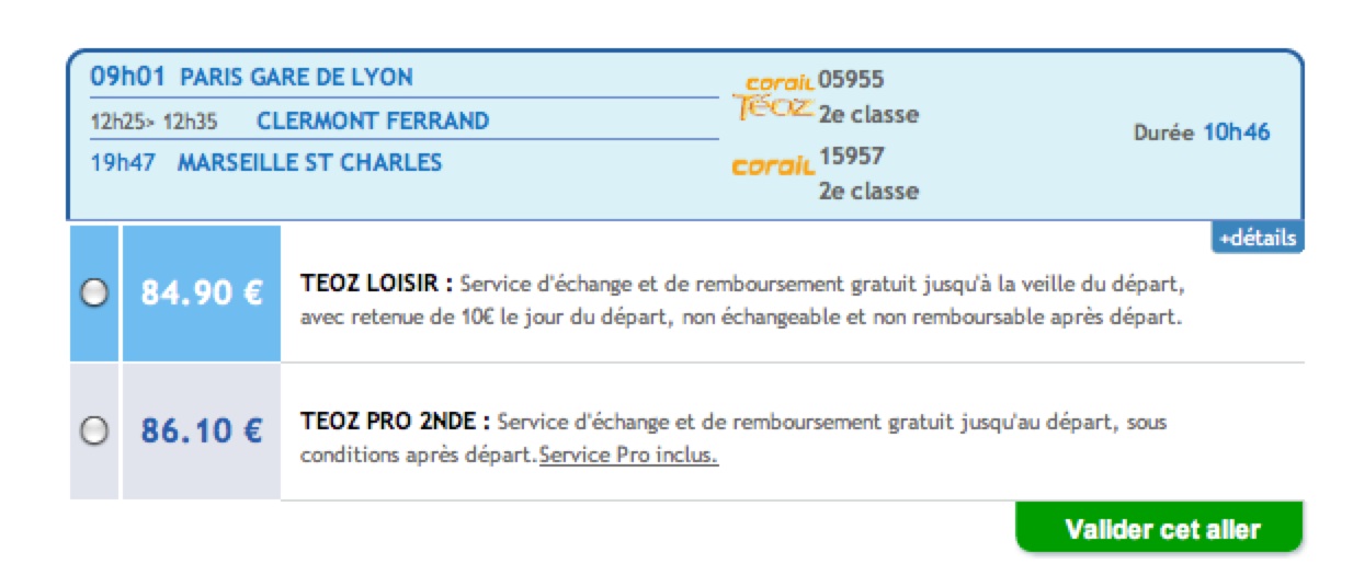 Une recherche de billet Paris-Marseille donne aussi le trajet via Clermont, c'est nouveau me semble-t-il. Par contre, Paris seulement, il ne trouve pas il faut préciser Paris (75) ou choisir dans la liste, ça c'est nouveau aussi, avant Paris suffisait. Bon, les fanas du feu Cévenol vont être contents, Youpi!