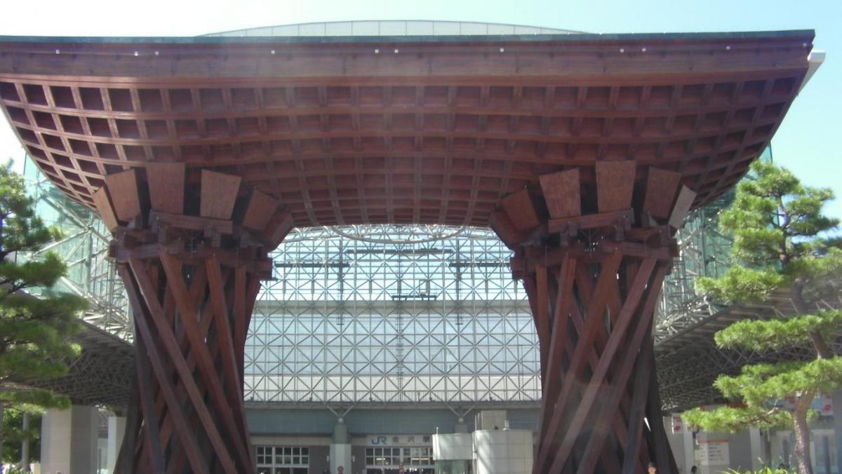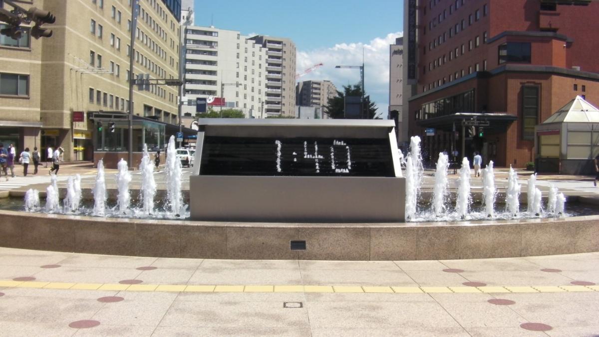 Tout à fait FanMSTS, c'est bien l'horloge-fontaine de la gare de Kanawaza. Kanawaza, ville de la côte Ouest qui attend d'être reliée au résau shinkansen par la nouvelle Hokuriku Line au printemps prochain. En se retournant, on peut voir le porche en forme de torii devant l'entrée: