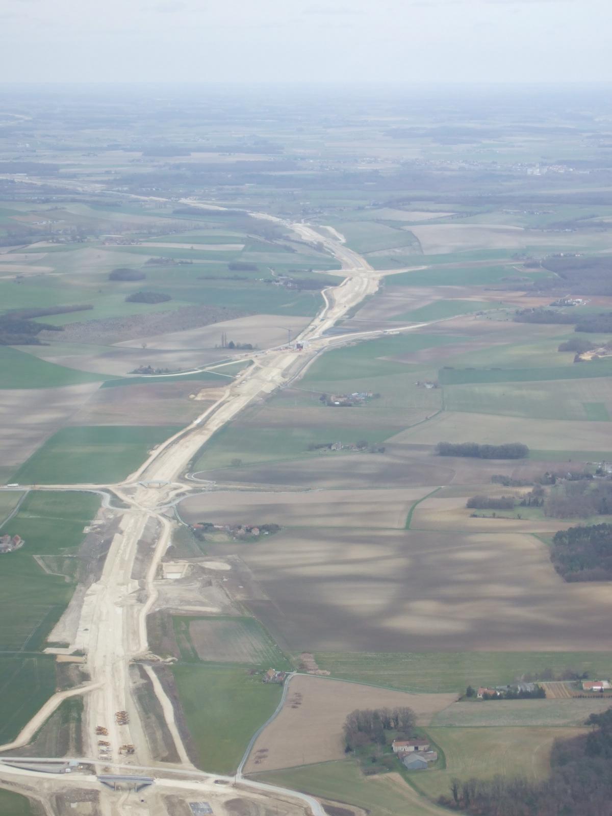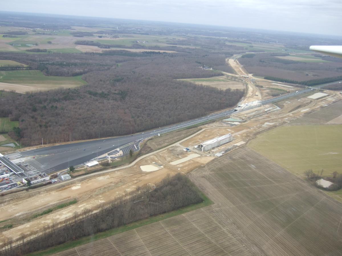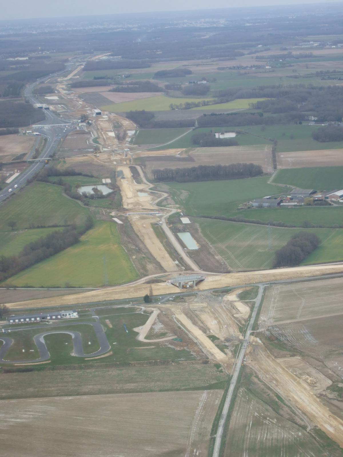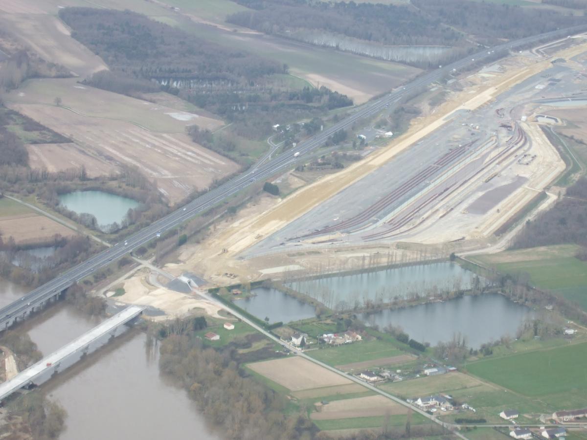 Merci pour le compliment. Mais je n'étais que passager et sans la généreuse invitation du pilote que je remercie vivement, je n'aurais pas pu vous présenter tout ceci. D'un autre côté, c'est plus facile de prendre les photos quand on n'est pas aux commandes! J'en remets quelques unes, désolé pour la qualité qui n'est pas extra. La base de travaux et le pont sur la Vienne: Vue vers le sud: Retour à la base de travaux avec tout à fait gauche de la photo le raccordement à l'ancienne ligne Port-de-Piles - Port-Boulet réactivée sur quelques kilomètres. Un lien sympa: http://www.litteratur.fr/?p=5742 Vue vers le nord au dessus de Villeperdue: Au niveau de l'échangeur de Monts-Sorigny: