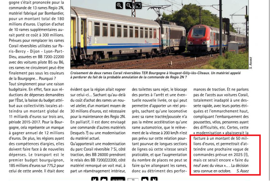commandez des voitures neuves à 2 niveaux seraient plus pertinent ....à voir ! les voitures vivalto c'est 1 million la voiture et 1.3 la voiture pilote pour les fs (valeur de 2005 : ) Pour la sncb c'est r 128 millions d'euros pour 72 nouvelles voitures à deux étages M6 soit 1.78 million d'euro (voitures roulant à 200 km h et à grand gabarit) comme le parc de voiture corail bourgogne est de 85 voitures + 17 voitures pilotes ça ferait 181 million pour des voitures belges et 107.1 millions pour des voitures italiennes Reste les locomotives qui seront pas donné .... on peut estimer le coût global à 160 millions d'euros (on peut reprendre une base de V2n avec des portes avec accès à 60 cm : ça mange pas de pain côté ingénierie et c'est du connu) Remarquez que c'est pas une différence si importante avec les automotrices omneo par contre rail passion dit que la facture serait que de 50 millions d'euros justement .(pièce jointe) ..qui a raison ???qui a tort ???