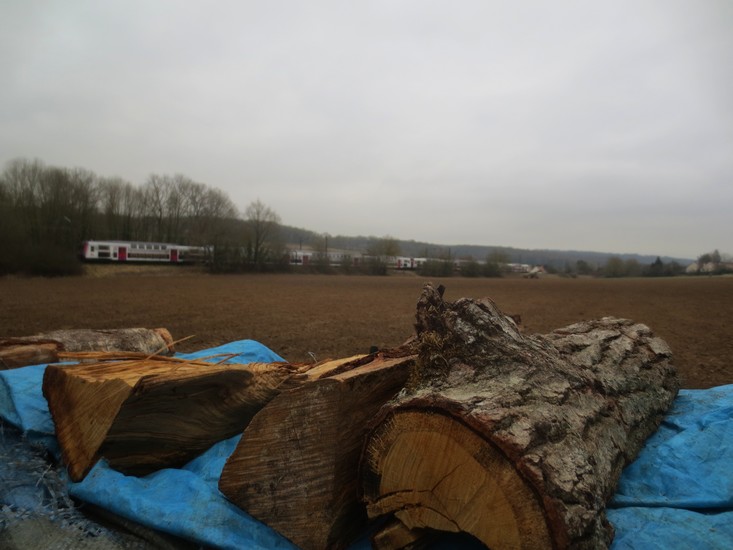 Salut , Mise au point , pas au top ... Le champ au fond du jardin , vient d'être mis en semis , ce qui forme un terrain bien régulier , mais la prise de vue comporte un défaut , à l'arrière plan de la photo , au niveau du train . Ce n'est pas trop trop grave , car les trains de banlieue circulent au moins à la demi-heure sur cette ligne C , ce qui m'aurait plus gêné , c'est le rater la photo avec un train particulier , comme le train de ballast que j'ai loupé tout à l'heure , car l'appareil photo n'était pas de sortie pour une fois ...