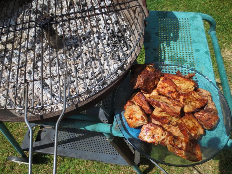 Salut , Rouelle grillée : La veille , découpez la viande en tranches , et laissez mariner avec un assaisonnement composé d'huile d'olive , de curry et de citron .