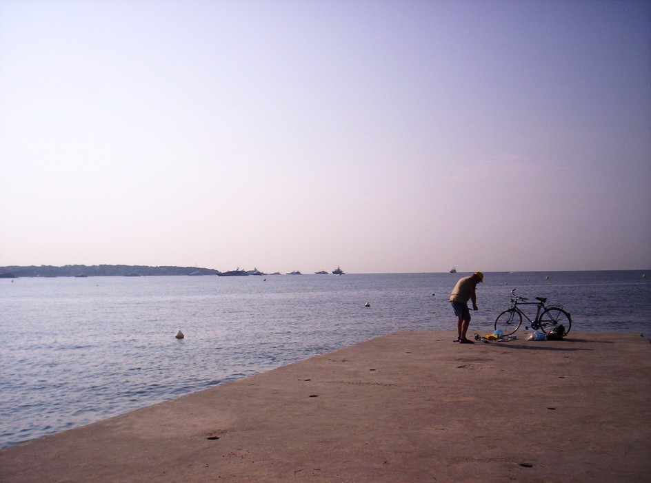 Hello , Choc des cultures : Il est 9h00 et ce pêcheur range son matériel avant l'arrivée de la horde de touristes sur la plage . Pendant ce temps , d'autres personnes dorment ou s'ennuient ferme dans leurs yachts qui forment des ronds dans l'eau entre Antibes et Golfe Juan ... Elle n'est pas belle la vie ? ...