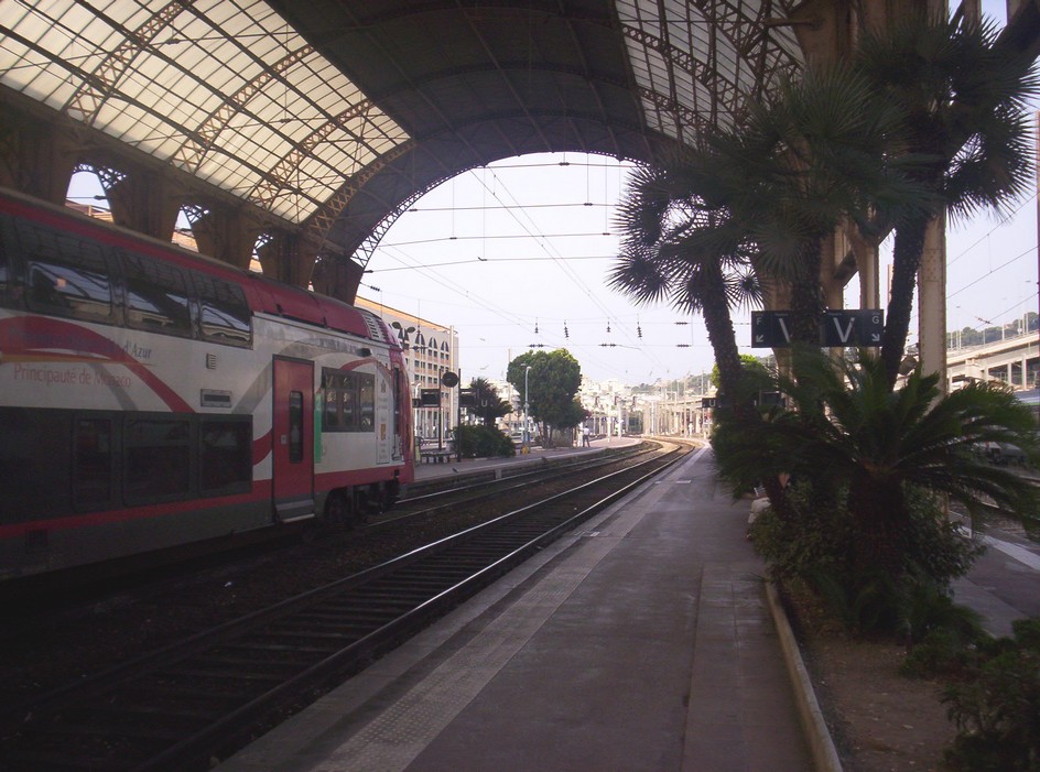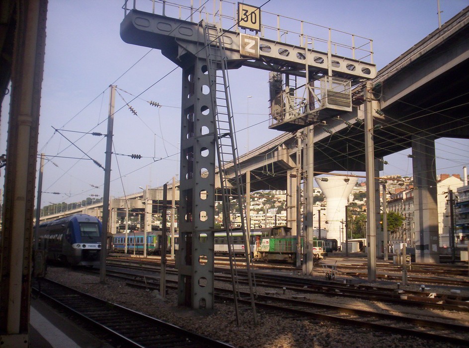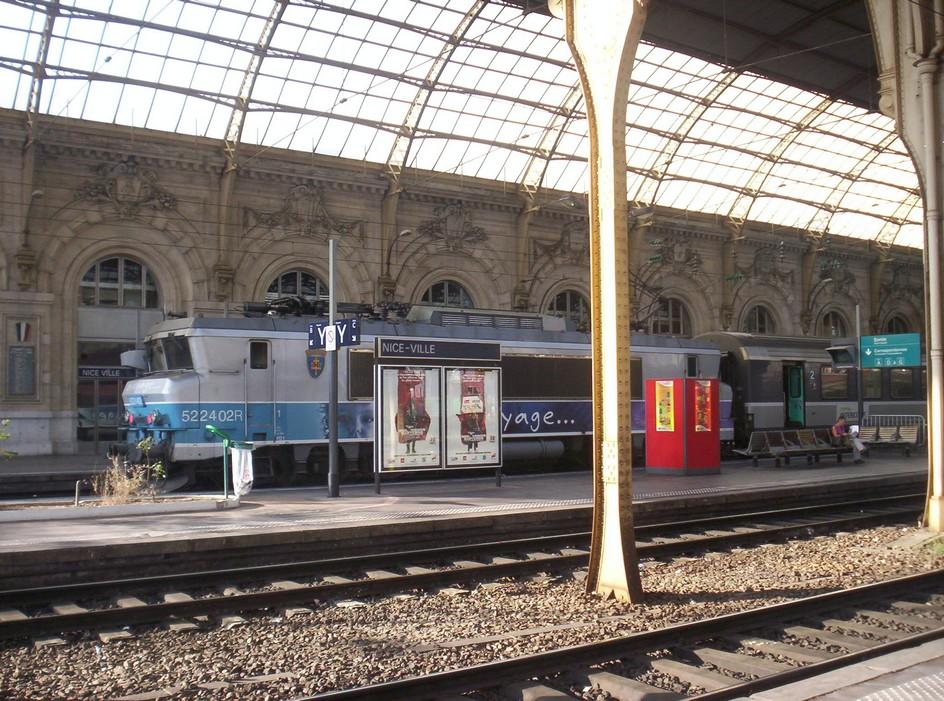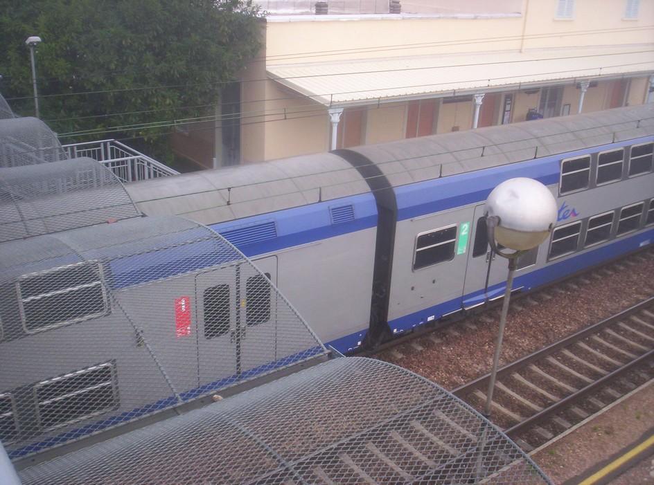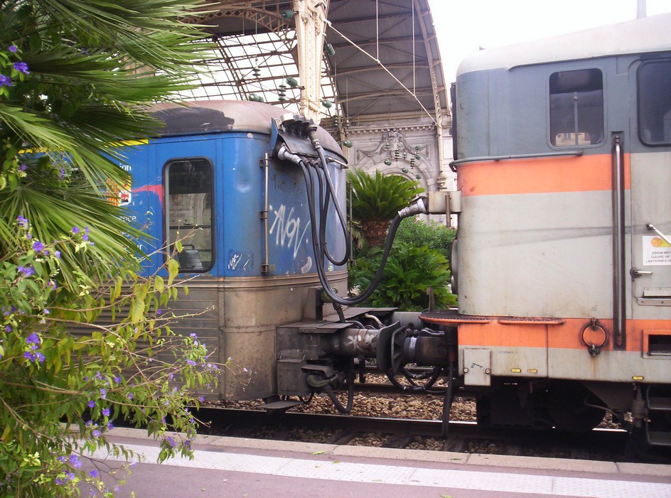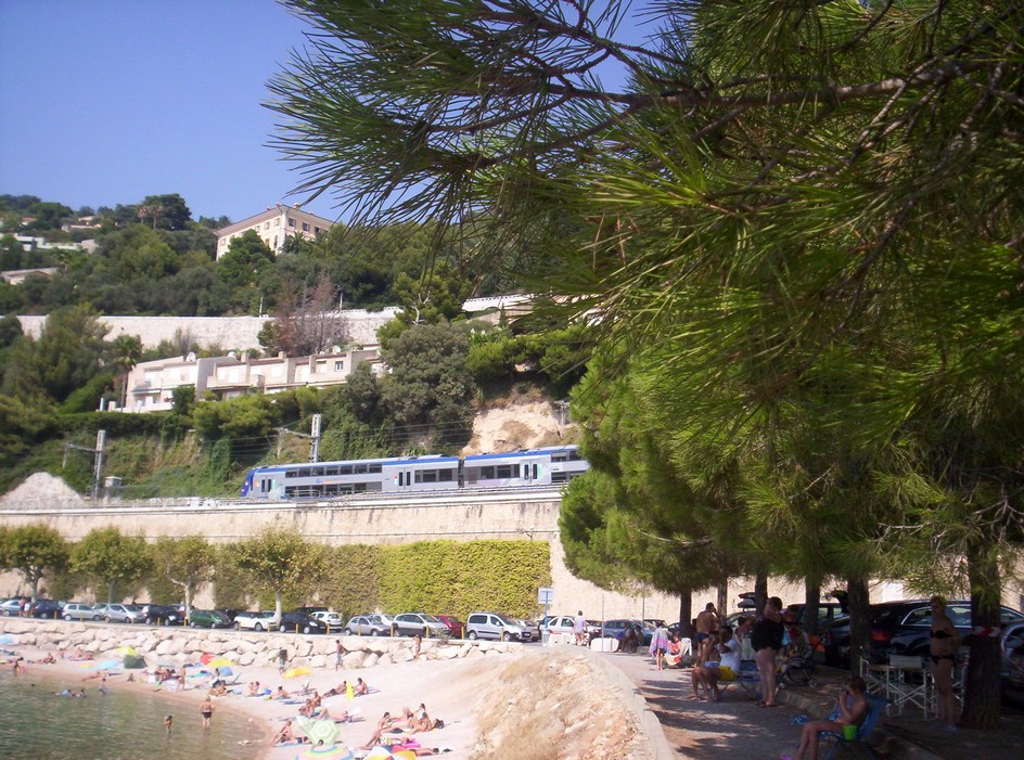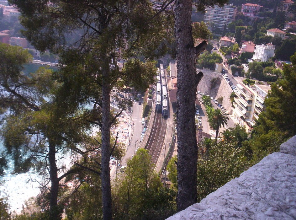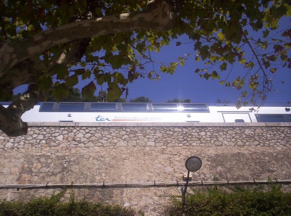 Hello , Danièle est retournée sur la côte d'Azur retrouver la grande bleue , tout en regrettant toutefois l'ambiance du collège de la région parisienne . Elle nous a invité une bonne semaine , afin de découvrir cette contrée que nous connaissions pas du tout . Cette merveilleuse semaine teintée de visites et d'amitié , m'a pourtant laissé un souvenir mitigé , car le secteur est bien bétonné et chaque recoin est bien occupé par des constructions plus ou moins "bling-bling" et ce jusqu'aux limites de l'arrière pays . Il est vrai que ma perception des Alpes-Maritimes se trouvait gravement affectée , par une sérieuse cure de désintoxication pratiquée en Auvergne et en Lozère la semaine précédente . Pour débuter le sujet de façon "hard" la seule photo ( à peu près) réussie du séjour , par ce train saisi avant son départ .