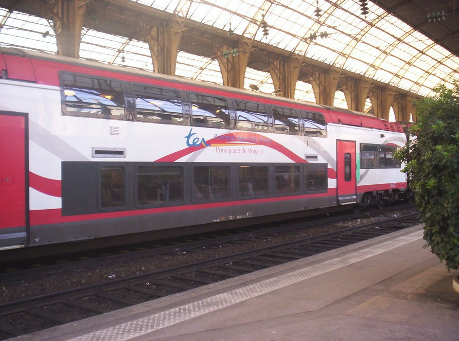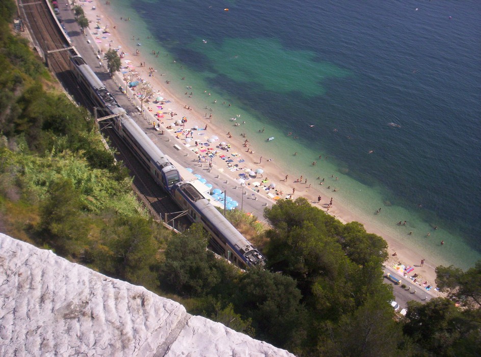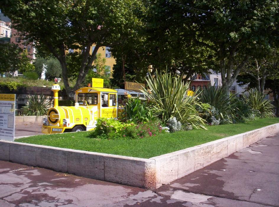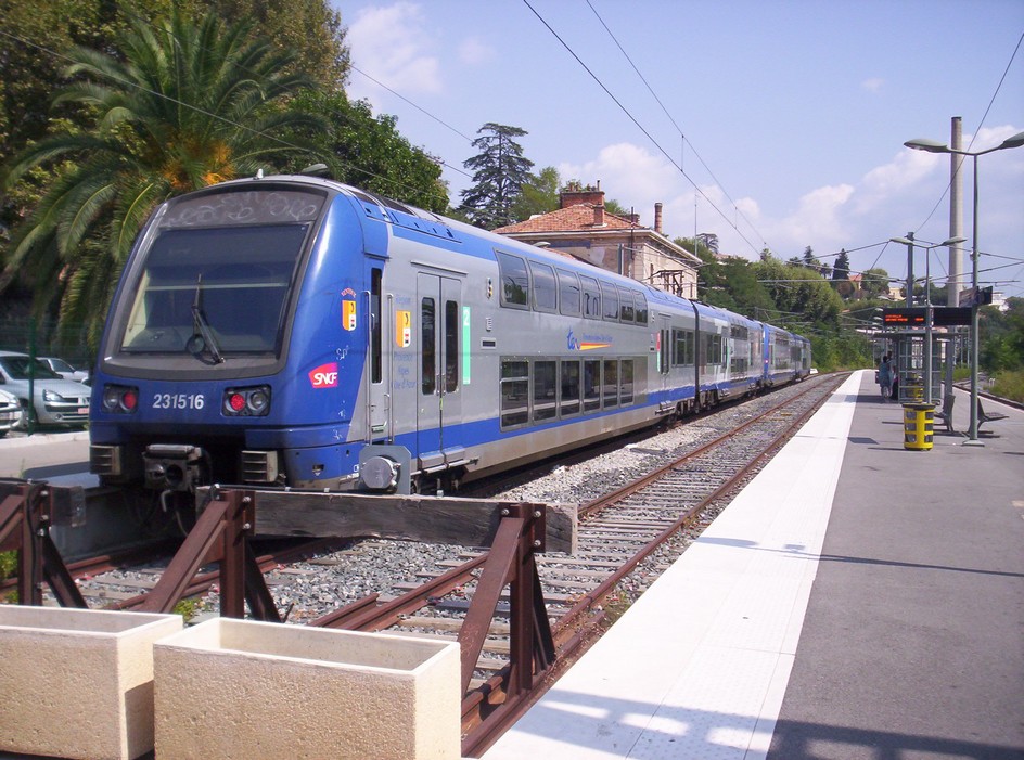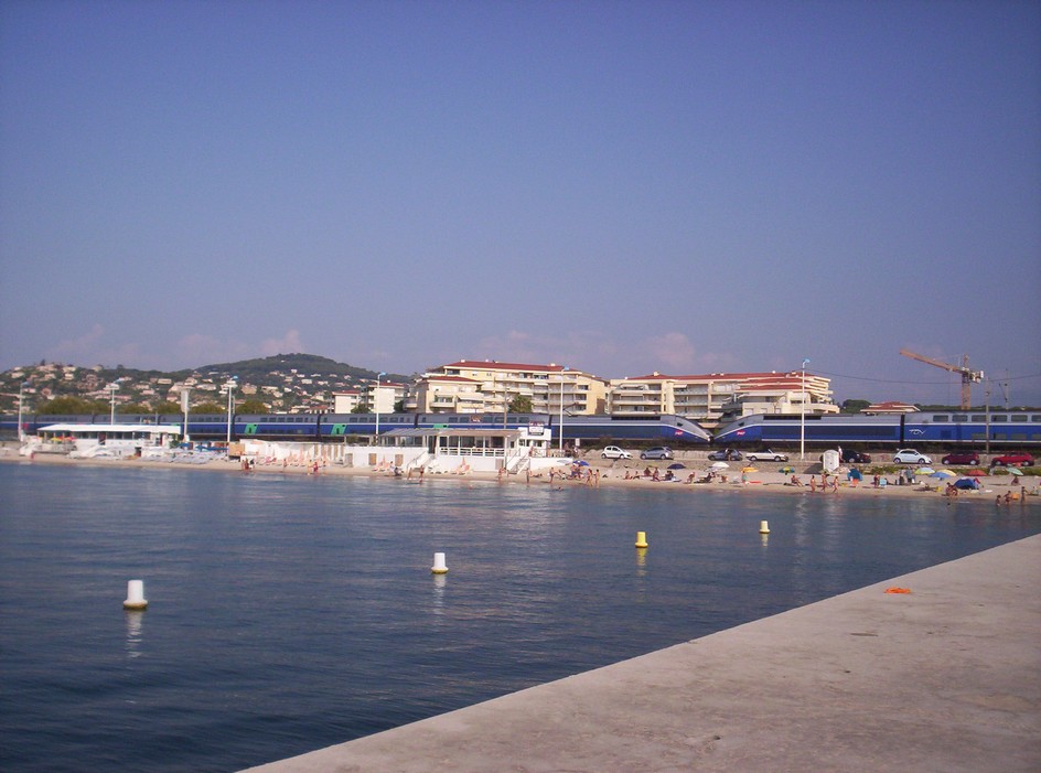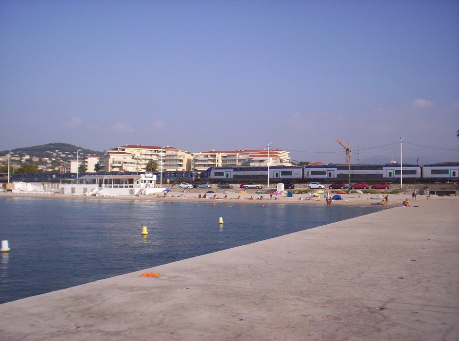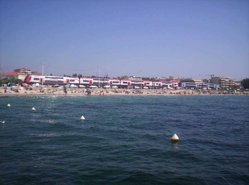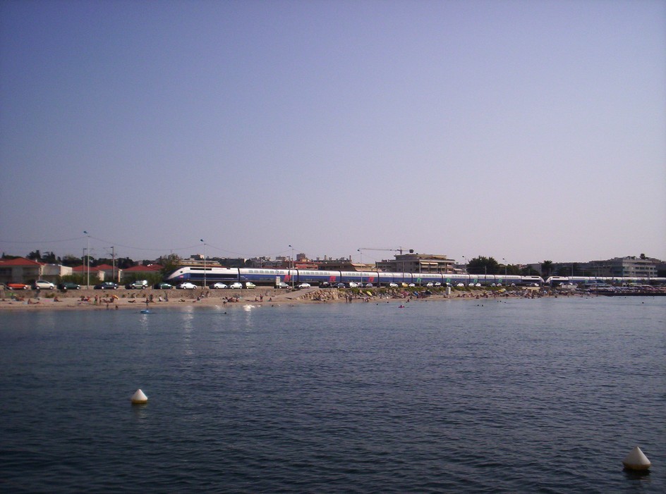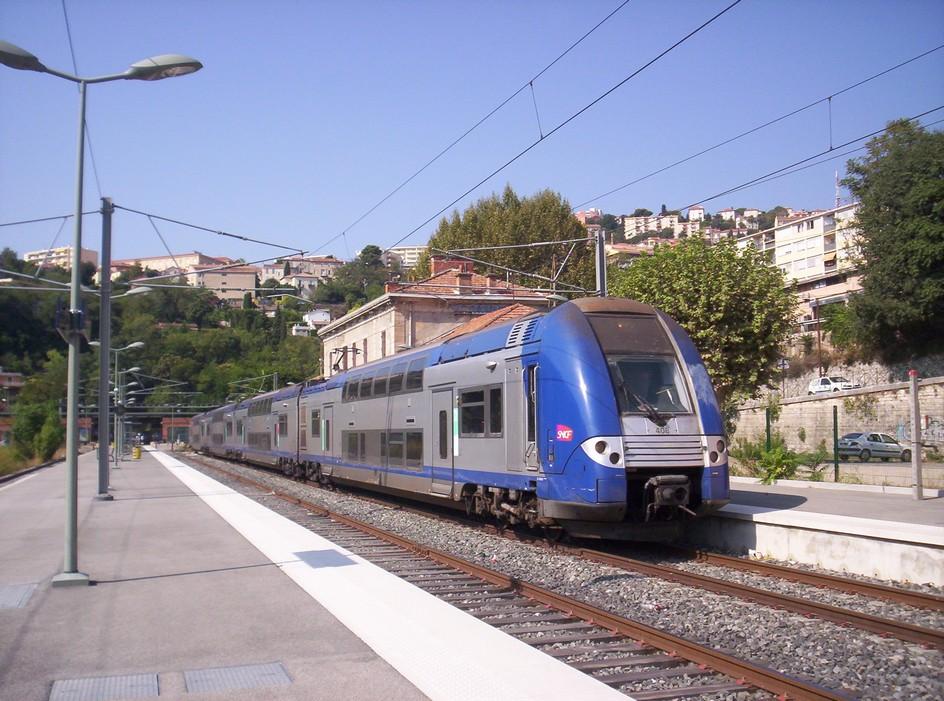 Hello , Danièle est retournée sur la côte d'Azur retrouver la grande bleue , tout en regrettant toutefois l'ambiance du collège de la région parisienne . Elle nous a invité une bonne semaine , afin de découvrir cette contrée que nous connaissions pas du tout . Cette merveilleuse semaine teintée de visites et d'amitié , m'a pourtant laissé un souvenir mitigé , car le secteur est bien bétonné et chaque recoin est bien occupé par des constructions plus ou moins "bling-bling" et ce jusqu'aux limites de l'arrière pays . Il est vrai que ma perception des Alpes-Maritimes se trouvait gravement affectée , par une sérieuse cure de désintoxication pratiquée en Auvergne et en Lozère la semaine précédente . Pour débuter le sujet de façon "hard" la seule photo ( à peu près) réussie du séjour , par ce train saisi avant son départ .