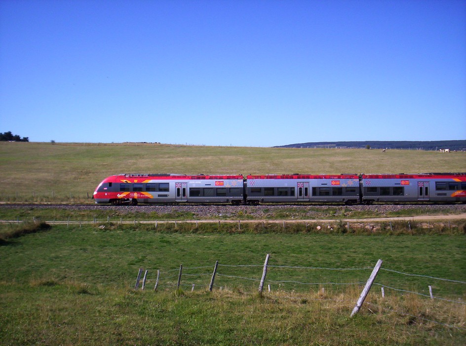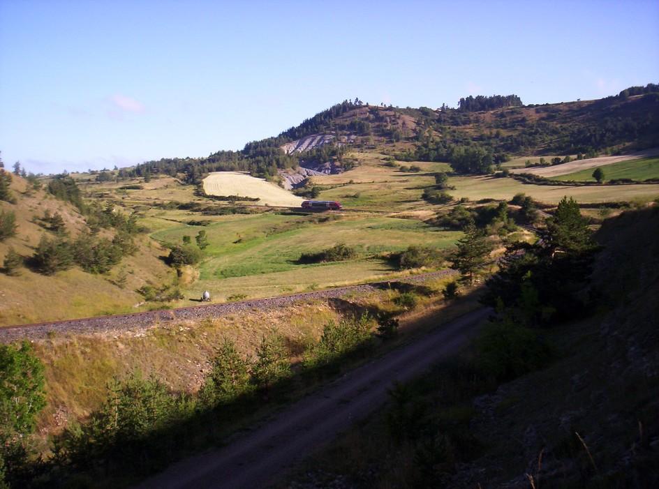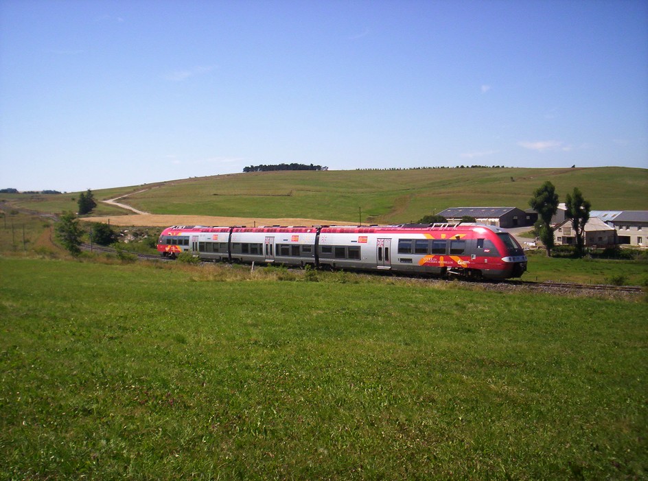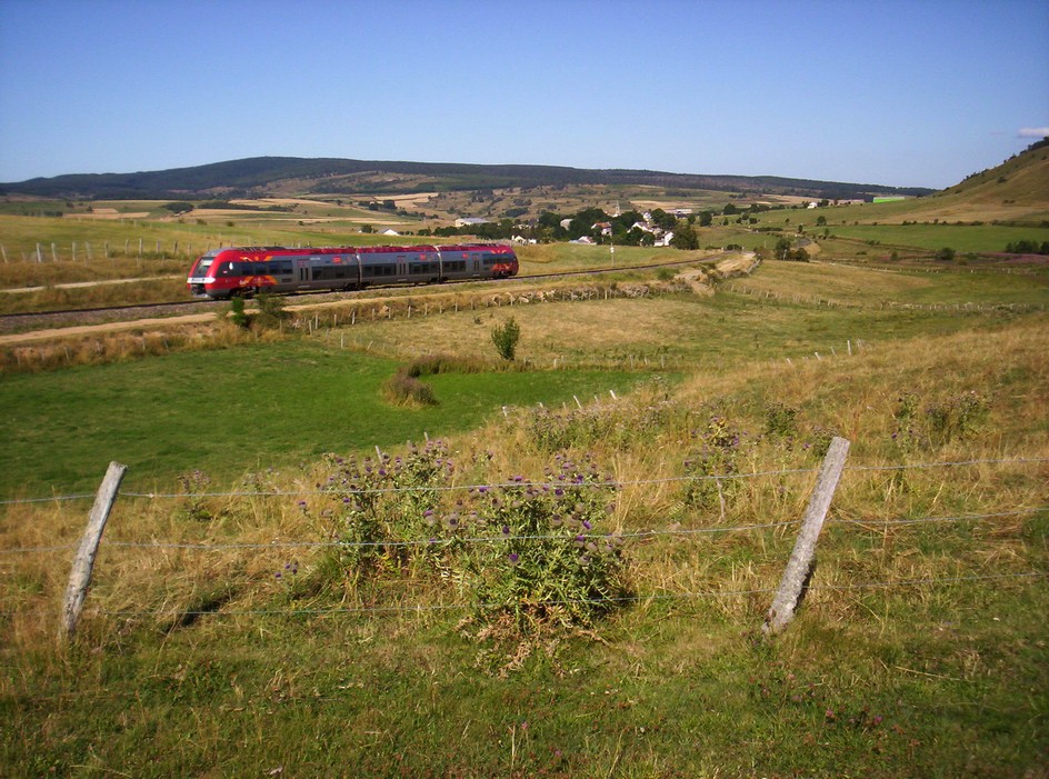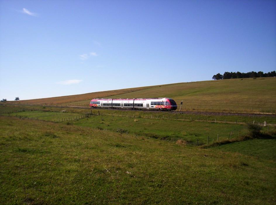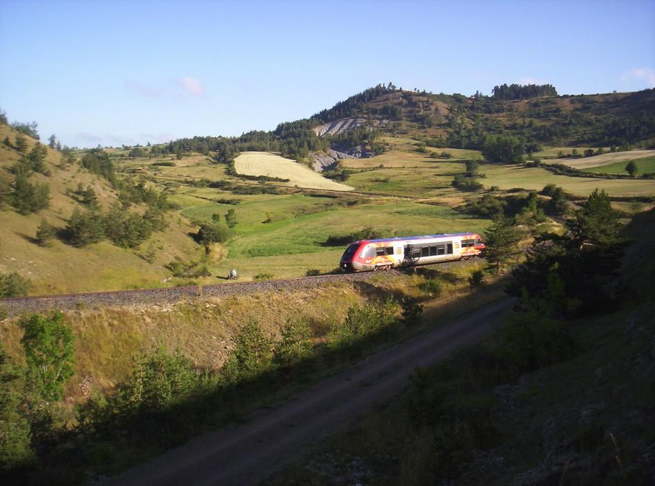 Bonjour , AGC le retour : Le même AGC vu dans la précédente série de photos , revient avec le TER 878925 Mende Alès . Mais à compter de la date du 04 octobre prochain , bon nombre de TER de cette ligne vont passer par la route Je ne sais pas si c'est faute de matériel ou pour des interventions travaux sur la voie , mais pour faire des photos sur cette splendide ligne il faudra se dépêcher avant cette date . Le train est "coupé" sur une photo controleursncf
