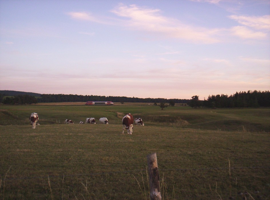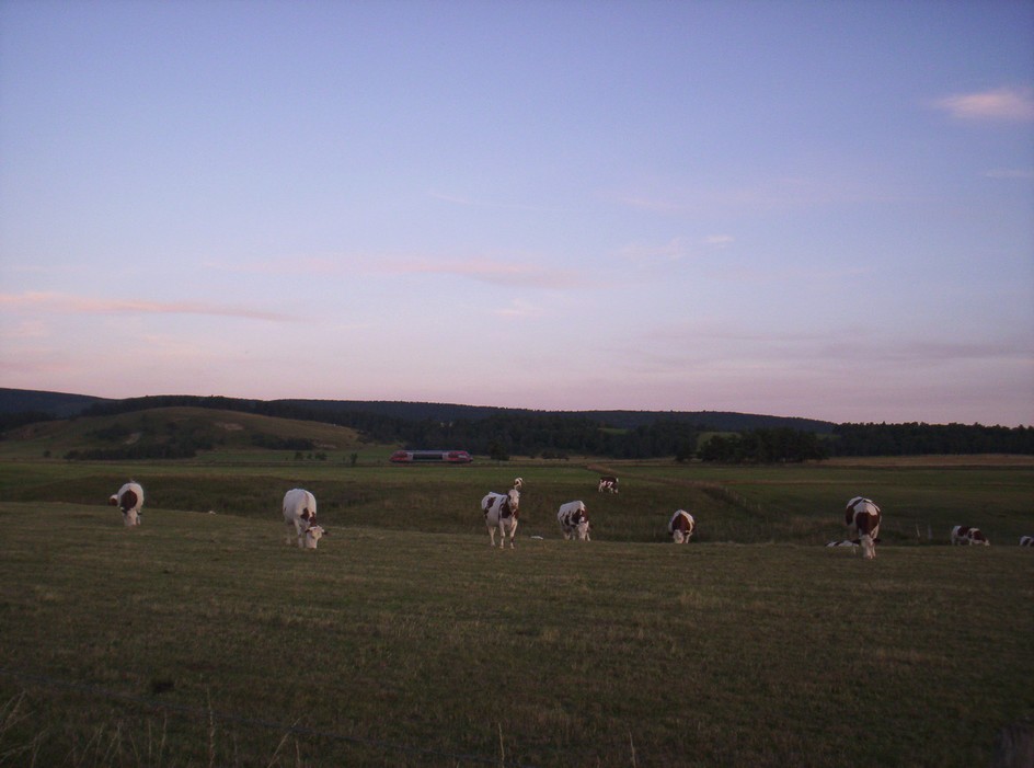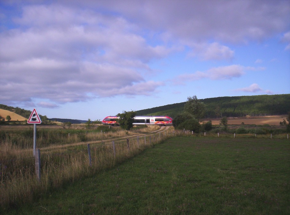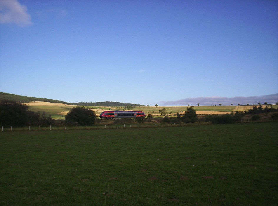 Bonjour , Toute la tribu étant partie en vacances , et possédant (...depuis juin 1983!!! ) les cartes topo IGN* du secteur le plus haut de la ligne La Bastide Mende Le Monastier , je suis parti voir sur place cette magnifique ligne la plus haute de France en traction thermique . Ayant effectué bon nombre de détours , j'arrive tard le soir pour saisir quelques photos à la tombée de la nuit , et lors du passage du TER 878922 La Bastide Mende le soleil avait passé la ligne d'horizon depuis 10 minutes . Le secteur pris en photo se situe sur le point culminant de la ligne posée à 1211 mètres d'altitude , non loin de la célèbre halte de Larzalier . * 2738 est et ouest édition 1980 au 1/25000 .