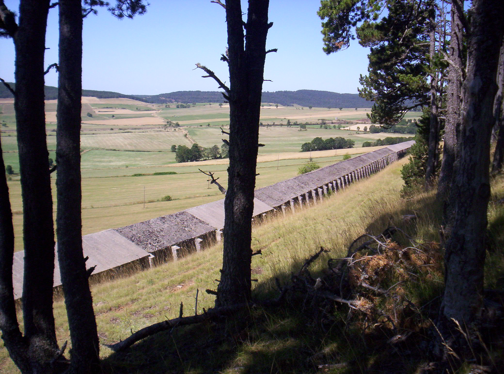 Bonjour , Portrait de galeries : Sans les galeries pare congères, situées de part et d'autre de la halte de Larzelier , la ligne Mende La Bastide serait souvent bloquée pendant l'hiver , dans sa partie située à flanc du causse de Montbel . Les deux ouvrages longs de 138 mètres pour la petite et 558 pour la grande , sont aidés par des barrières pare neige posées sur la fin du plateau du causse . Sur une photo , la draisine semble bien petite dans ce superbe "décor" .