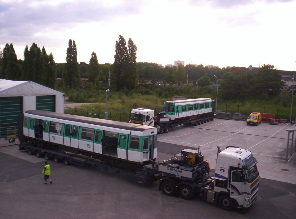 Salut , Métro fer ... sur pneus : Non cette rame de type MF 77 de la RATP ne veut pas imiter ses cousines sur pneus du type MP . A l'occasion de leur rénovation et leur révision complète , ces rames du métro parisien , sont désassemblées à l'atelier RATP de Bagneux (92)* , puis chacune des motrices et remorques sont convoyées par la route aux ateliers RATP de Boissy Saint Léger (94) pour leur passage en grands travaux , qui correspondent à une opération mi-vie pour ce matériel . A leur retour , les véhicules flambant neufs sont assemblées et peuvent de nouveau circuler sur la ligne 13 du métro . * on voit l'atelier RATP derrière les voies SNCF du TGV Atlantique , ces terrains on été cédé par la SNCF et la mairie de Bagneux pour la construction de ceux -ci .