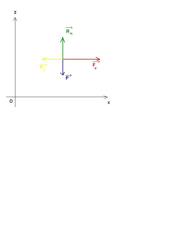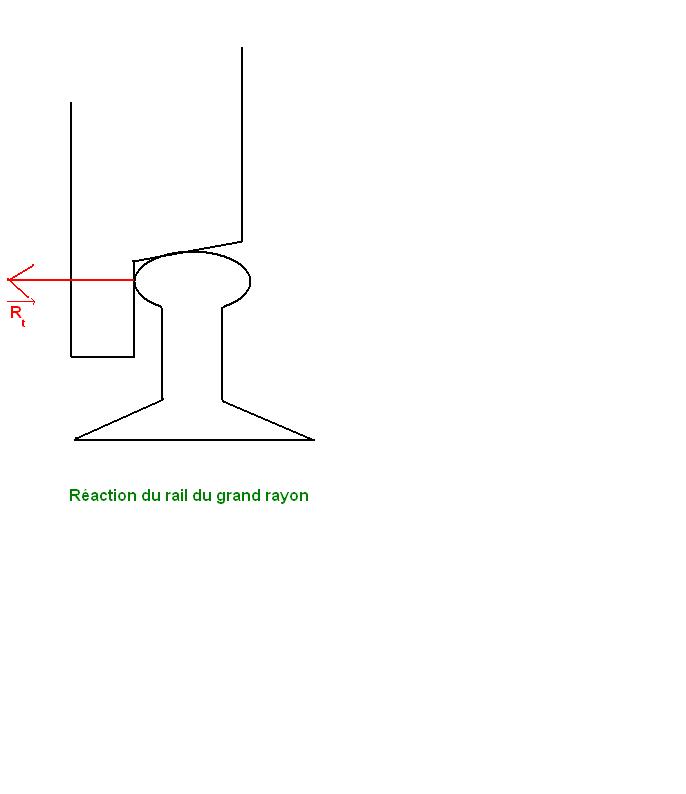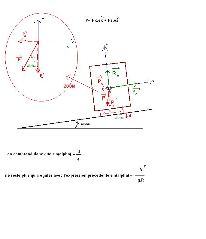 Je mettrais les schémas à la fin car ça me prends du temps... je les fait au fur et à mesure. On continue la démo: III) Si le dévers n'existait pas... Imaginons une courbe sans dévers, pas évident... voilà ce que ça donnerait: Equilibre dans R': 0=Rn+P+fe+Rt Projection de l'équilibre sur Ox et Oz: selon Ox: fe-Rt=0 (on parle ici de normes) selon Oz: Rn-P=0 ce qui nous donne (en norme) Rn=P et fe=Rt cette dernière expression voudrait dire que la réaction tangentielle devrait être égale à la norme de la force centrifuge, en terme d'intensité de force c'est une abbération. La réaction du rail ne peut pas compenser la force centrifuge. Donc dans l'idéal il faudrait "incliner" le poids pour qu'il ait une composante selon Oz et ainsi compenser la orce centrifuge. Pour "incliner" le poids on va incliner la voie, en effet l'angle alpha d'inclinaison sera le même que l'inclinaison du poids par rapport à l'axe vertical à la voie. Les schémas: référentiels: si le dévers n'existait pas: la réaction du rail: