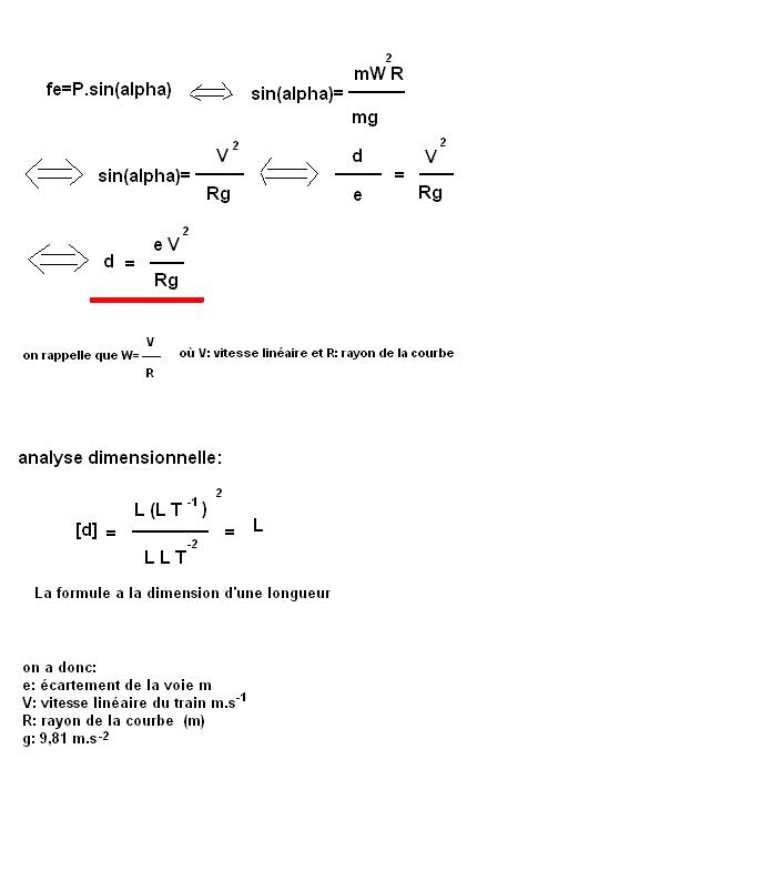 (suite et fin pour ce soir) désolé pour ceux que cela barberait, donc pour les 4-5 qui restent, (j'oublie pas celui va se réveiller du dodo demain) schéma et relations nécessaires à ce qui précède (toujours sur paint): Avant de discuter de la formule obtenue: Application numérique: pour une circulation à v=160 km/h (soit 44,44 m/s) dans une courbe de 2000m avec un écartement de 1437mm on a un dévers calculé d=0,145m. On a donc une approximation qui se respecte. Cordialement