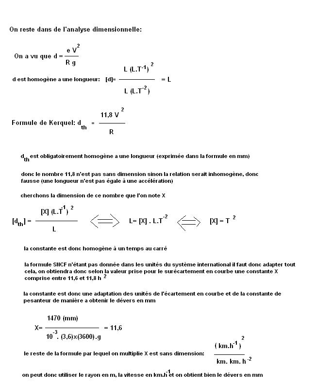 Bonsoir et merci d'avoir suscité cette réflexion! Pour l'origine de la constante 11,6- 11,8 elle provient (comme on le voit dans les équations aux dimensions postée précédemment) de l'harmonisation des unités car le calcul fait avec la formule SNCF met en jeu des unités non SI (Système International). On a donc au numérateur l'écartement en mm comme on cherche le dévers en mm on doit se débrouiller pour que toutes les autres unités "se neutralisent". Comme on veut conserver le rayon en mètre on a un facteur 0,001 qui intervient ce qui nous arrange puisque on convertit g (9,81 m/s-2) en km/h-2 ce qui revient à multiplier par 3,6 puis 3600. On a donc au final (comme montré) cste= 1470/(9,81x3,6x3,6)=11,8 (environ). Cordialement