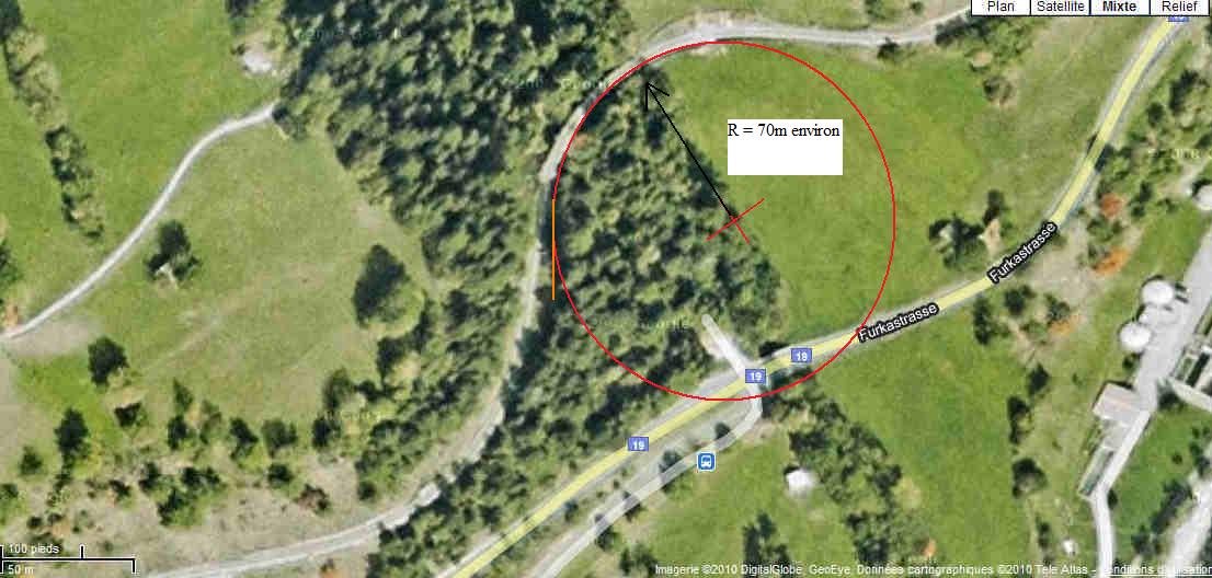 Un très rapide essai pour tenter de déterminer le rayon de courbure (je me suis basé sur l'image google earth précédente, ce que je dis ne vaut que si on est bien sur la bonne courbe). J'ai tenté (très vite donc ce n'est qu'approximatif) de tracer le cercle osculateur à la pleine courbe, si on se réfère à l'échelle indiquée en bas à gauche, on a une courbe qui fait tout juste 70m de rayon, c'est serré, voire trés serré je trouve. Sur la gauche, on dirait qu'il n'y a qu'un raccordement par la tangente, sur la droite, une forme de RP semble exister (à confirmer par un pro). Après la courbe situé à droite en suivant a elle un rayon de courbure plus grand. L'alignement de transition entre les deux est assez court. Ce ne sont bien sûr que des éléments et pistes de réflexion (nullement une analyse).