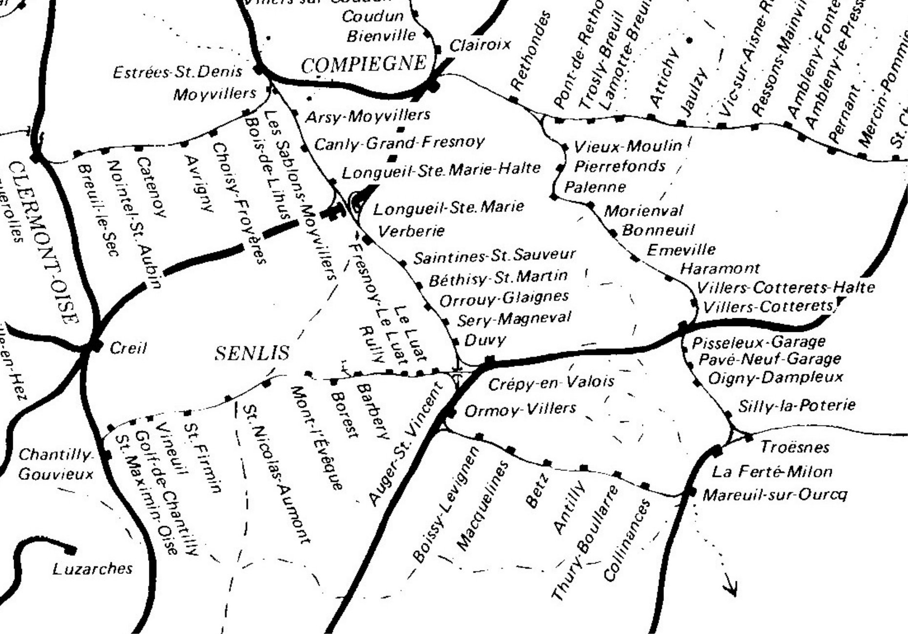 Nous y sommes, à 100m près à la fin de la courbe ; c'est la bif de la ligne d'Ormoy vers Chantilly Gouvieux par Senlis, ligne déclassée et dont le tracé est de toutes façons coupé par la LGV Nord. Cette ligne était aussi reliée à Crépy en Valois. (carte tirée du Tome 4 de Trains Oubliés, ed.du Cabri) Mareuil, la Ferté, c'est tout à l'opposé Au suivant ... mdrmdr