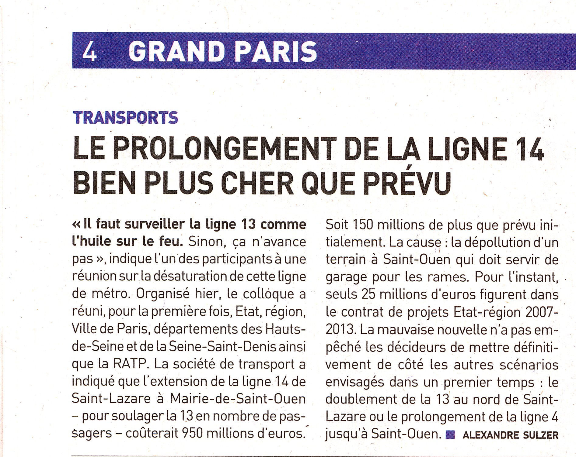 Péripétie... A vos porte monnaie messieurs, dames : La facture de la prolongation de la ligne 14 s'étoffe ... Source : 20 minutes le 27 février 2009