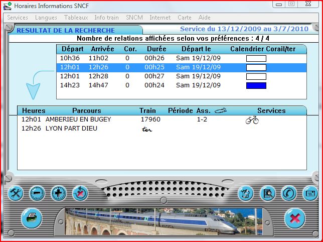 sur RIHO pour PC il y a au moins un probleme , le 12h01 LYD 12h26 n'existe pas , pas contre il manque le 12h04 LYD12h49 , le 12h23 LYD 12h47 , le 14h03 LYD 14h43 ,le 14h56 LYD 15h18 , le 13h00 LYD 13h25 qui est sur le site TER RA mais ni sur RIHO PC et PPC et j arrete la mais cela continue pour toute la journée !!!!!!!!!!!