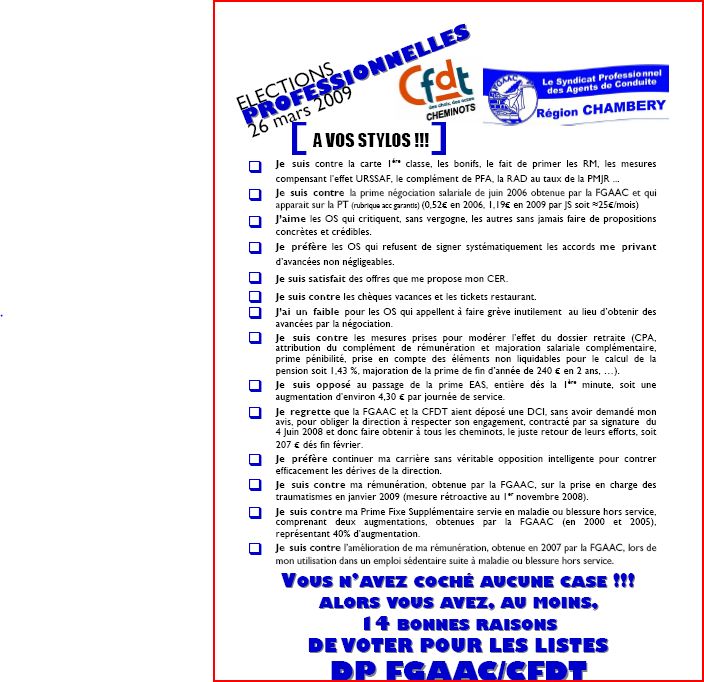 Salut Premièrement je ne cherche pas a déclencher une émeute ! je met juste en ligne une info ! Si tu te sens attaqué tu as surement tes raisons ! La démocratie n'est pas le leitmotive de la FGAAC Des carriéristes y'en a pleins et je leurs laisse bien la place! Je ne fait du syndicalisme que au niveaux local , le reste m'intéresse beaucoup moins ! Au sujet des bonnif comme dit plusieurs fois ici mais , le système mis en place en 2009 l'a été grace àla négociation de la FGAAC (qui n'a reçu aucun VETO des autres OS) sinon il n'y en aurais plus ( voir la RATP) mais cela tu n'es pas pret de l'accepter ! Le résultat de 2007 est largement bien vu au rapport de force de 1995 ou il y avait plus d'un million de personne dans la rue , SNCF RATP EDF GDF FT EN et autres...... En 2007 30% de cheminot environ autant a la RATP 3% a EDF et GDF et autre on est bien loin du MILLION . CEUX qui croyaient (et le croient encore) que le rapport de force afin de sauver nos retraite était la, sont de doux rêveurs voir pire ! Et que la FGAAC est le syndicat qui défend le mieux les conducteurs est un fait , mais la encore tu ne peux l'accepter . Quand je dit le mieux , je ne dit pas parfait , bien au contraire car plusieurs points ou positions de la FGAAC ne sont pas les miennes.Mais ce n'est pas pour cela que je vais quitter en tenant des propos critiques voir insultants mon syndicat , car le seul que ça amuse c'est le patron alors que le militant , simpatisant et autre rigole , mais plutot jaune . SI les urnes me désavouent soit ! Mais le choix des urnes est parfois bien surprennant !!! ( 2 dernieres élections présidentiel !!! )