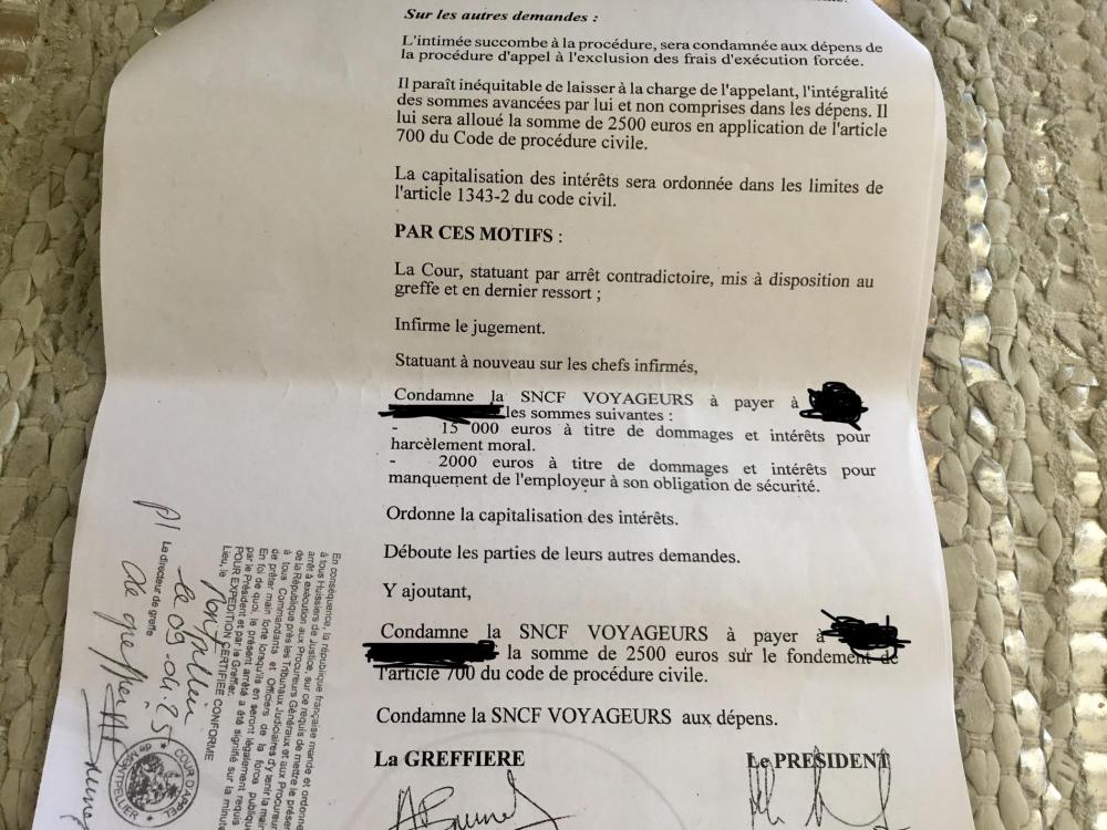 1. Bonjour a tous , cheminots actifs et retraités Après plus de cinq ans de combats,3 en tant que actif et 2 en tant que retraité, je tiens à vous faire part de l’évolution de mon dossier. Je me suis exprimé sur différents posts , mais celui ci étant le plus opportun. Ayant été débouté au prud’homme et au pénal (février 2023),3 mois avant de partir à la retraite ( mai 2023), calcul savamment fait par les conseillers juridiques de la boîte ,j’ai décidé de faire appel dans les 2 dossiers prudhommale et pénal avec l’assistance d’un nouvel avocat . En avril 2025 , le tribunal prudhommale a infirmé la première décision (voir doc ci-joint) J’attire votre attention sur la condamnation sur le manquement de l’employeur à son OBLIGATION DE SÉCURITÉ. A ma grande surprise, cette condamnation qui ne relève pas d’un tribunal prudhommale, mais plutôt pénal et celle qui me soulage le plus , car c’est celle qui a été ma motivation première dans ma démarche, avant mon cas personnel. Ayant attendu les 2 mois , ou les condamnés pouvaient se pourvoir en cassation, ce qu’ils n’ont pas fait , mon avocat a fait parvenir le jugement au procureur de la république début juin 2025 , auprès duquel mon appel avait été fait( ayant pour cela versé la somme de 1500€ de consignation) . j’ai déjà reçu ma convocation chez un juge d’instruction, sur demande du procureur de la république. Cordialement.